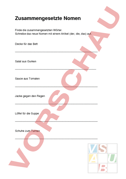 Zusammengesetzte Nomen Finde die zusammengesetzten Wörter. Schreibe das neue Nomen mit einem Artikel (der, die, das) auf. Decke für das Bett Salat aus Gurken Sauce aus Tomaten Jacke gegen den Regen Löffel für die Suppe Schuhe zum Turnen Zusammengesetzte Nomen Suche die zwei Nomen, die zusammenpassen. Wenn du alle gefunden hast, schreibe alle neuen Nomen mit dem richtigen Artikel (der, die, das) auf die Linien. das Bild das Schild die Wand der Platz das Feld der Schein das Licht die Mühle die Hand das Boot der Schlauch der Schuh der Wind der Schirm das Geld der Schalter_ der Sport die Maus der Verkehr die Tafel Schreibe die folgenden Sonnennomen auf die untenstehenden Linien. Schreibe das neue Nomen immer mit einem Artikel (der, die das) auf. Die Geschichte der zusammengesetzten Nomen Es war einmal ein Bäckermeister, der buk an jedem Wochentag gute Schinkengipfel. Eines Tages sagte er aber: „Jetzt mag ich nicht mehr backen! Ich möchte eine Weltreise machen. Also packte er sein Schlauchboot in sein Auto. Lange fuhr er auf Landstrassen quer durch fremde Dörfer, bis er zu einem grossen Kirchturm kam. Er hielt an, stieg aus und schloss die Autotür. Erst jetzt merkte er, dass es ganz viele Regenwolken am Abendhimmel hatte. Schnell ging er in ein Restaurant und bestellte sich einen Himbeersirup. Als es fertig geregnet hatte, verlies der Bäckermeister das Restaurant wieder. Aber, oh Schreck! Die ganze Strasse war voll Regenwürmer. Der Bäckermeister musste gut Acht geben, dass er die Regenwürmer nicht mit seinen Schuhsohlen zertrat. Unterstreiche die zusammengesetzten Nomen mit braunem Farbstift. Schreibe die zusammengesetzten Nomen auf wie im Beispiel. Der Regenwurm der Regen der Wurm Zusammengesetzte Nomen Sieh dir die Wörter, die unten in den Figuren stehen, gut an! Bilde zusammengesetzte Nomen daraus. Achtung! Einige Wörter passen nicht. Bade Seife, Hose, Blume, Zeit, Mantel, Tuch, Schere, Meister, Kappe, Kleid, Stift, Wasser, Wanne, Wolke