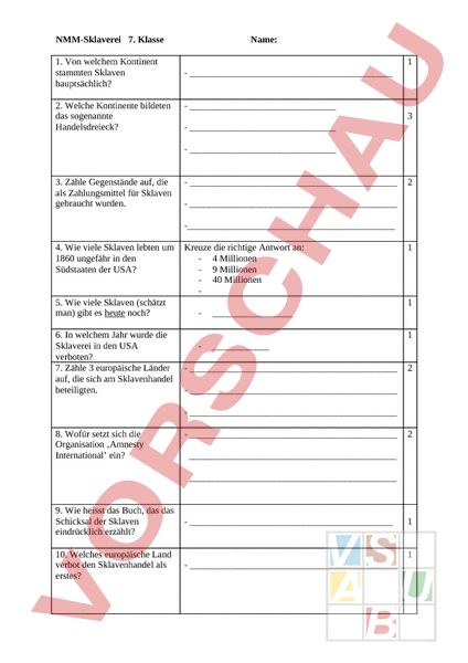NMM-Sklaverei 7. Klasse 1. Von welchem Kontinent stammten Sklaven hauptsächlich? 2. Welche Kontinente bildeten das sogenannte Handelsdreieck? Name: 1 3 3. Zähle Gegenstände auf, die als Zahlungsmittel für Sklaven gebraucht wurden. 2 - 4. Wie viele Sklaven lebten um 1860 ungefähr in den Südstaaten der USA? 5. Wie viele Sklaven (schätzt man) gibt es heute noch? 6. In welchem Jahr wurde die Sklaverei in den USA verboten? 7. Zähle 3 europäische Länder auf, die sich am Sklavenhandel beteiligten. Kreuze die richtige Antwort an: 4 Millionen 9 Millionen 40 Millionen 1 1 1 2 8. Wofür setzt sich die Organisation ‚Amnesty International ein? 2 9. Wie heisst das Buch, das das Schicksal der Sklaven eindrücklich erzählt? 10. Welches europäische Land verbot den Sklavenhandel als erstes? 1 1 11. Wie lange dauerte eine Überfahrt auf einem Sklavenschiff etwa? 12. Wo wurden Sklaven als Arbeitskräfte eingesetzt? 1 1 13. Was ist der hauptsächlichste Grund, dass sich Sklaverei auch noch heute ausbreiten kann? 14. Das Verbot zur Sklaverei der Nordstaaten der USA, führten zu einem ., weil sich die Südstaaten nicht an die Abschaffung der Sklaverei halten wollten. 15. Wie heisst der amerik. Präsident, der sich für die Abschaffung der Sklaverei einsetzte? 1 1 1 Viel Glück! Max. Pkte.20 20,196/18,175.5/16,155/14,134.5/12,114/93.5/8,73/6,52.5/42/31.5/2,11