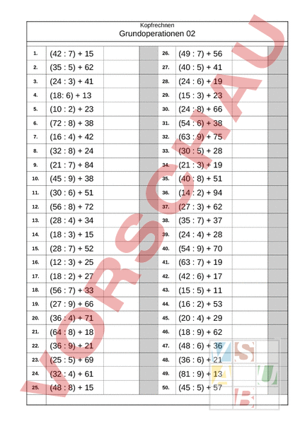 Kopfrechnen Grundoperationen 02 1. (42 7) 15 26. (49 7) 56 2. (35 5) 62 27. (40 5) 41 3. (24 3) 41 28. (24 6) 19 4. (18: 6) 13 29. (15 3) 23 5. (10 2) 23 30. (24 8) 66 6. (72 8) 38 31. (54 6) 38 7. (16 4) 42 32. (63 9) 75 8. (32 8) 24 33. (30 5) 28 9. (21 7) 84 34. (21 3) 19 10. (45 9) 38 35. (40 8) 51 11. (30 6) 51 36. (14 2) 94 12. (56 8) 72 37. (27 3) 62 13. (28 4) 34 38. (35 7) 37 14. (18 3) 15 39. (24 4) 28 15. (28 7) 52 40. (54 9) 70 16. (12 3) 25 41. (63 7) 19 17. (18 2) 27 42. (42 6) 17 18. (56 7) 33 43. (15 5) 11 19. (27 9) 66 44. (16 2) 53 20. (36 4) 71 45. (20 4) 29 21. (64 8) 18 46. (18 9) 62 22. (36 9) 21 47. (48 6) 36 23. (25 5) 69 48. (36 6) 21 24. (32 4) 61 49. (81 9) 13 25. (48 8) 15 50. (45 5) 57