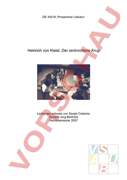 DE 450 M, Proseminar Literatur Heinrich von Kleist, Der zerbrochene Krug Leistungsnachweis von Sergio Colacino Dozent: Jürg Berthold Herbstsemester 2007 Leistungsnachweis DE 450 Sergio Colacino Inhaltsverzeichnis 1. Einleitung und Fragestellung 3 2. Das Problem des Vertrauens 4 2.1 Kleist und Immanuel Kants Erkenntnistheorie 4 2.2 Zwischenmenschliche Konflikte 4 2.2.1 Konflikt Eve – Ruprecht 4 2.2.2 Konflikt Eve – Adam 5 3. Symbolische Bedeutungen des zerbrochenen Krugs 7 3.1 Der zerbrochene Krug als Vertrauensbruch 7 3.2 Der zerbrochene Krug als Ehrbruch 7 4. Fazit 8 5. Literaturverzeichnis 9 Heinrich von Kleist 2 Der zerbrochene Krug Leistungsnachweis DE 450 Sergio Colacino 1. Einleitung und Fragestellung „Heinrich von Kleists Lustspiel Der zerbrochene Krug findet in doppelter Hinsicht heute noch die Aufmerksamkeit der Leser wie der Theaterwelt, [.]. „Das heitere Spiel um den sündigen Dorfrichter als verunglückten Liebhaber und der tragische Lebensweg seines Dichters scheinen zueinander im Widerspruch zu stehen, vermögen jedoch gerade deshalb unser Interesse an beiden zu wecken.1 Sowinskis Beschreibung widerspiegelt sich in meiner Wahl des Werkes, mit dem ich mich genauer auseinandersetzen möchte. Zu Beginn des Herbstsemesters 2007 hörten wir einen Ausschnitt aus einem Polizeirapport über Heinrich von Kleist, der auf tragische Weise Selbstmord begann, nachdem er seine damalige Freundin Henriette Vogel erschossen hatte. Diese Tatsache hat die Neugier in mir geweckt, in seinen Werken nach autobiographischen Stellen zu suchen und seine Art zu schreiben vertiefter zu betrachten. Dies ohne dass ich je zuvor ein Werk von ihm gelesen habe. Während des Semesters hatte ich die Gelegenheit mehrere Werke kennen zu lernen und dabei hat mir Der zerbrochene Krug am besten gefallen. Im Verlauf des Dramas treten verschiedene zwischenmenschliche Konflikte auf, die allesamt unter dem Aspekt der Vertrauensproblematik betrachtet werden können. Neben den diversen Beziehungskrisen steht auch eine institutionelle Problematik im Vordergrund: das Misstrauen gegenüber der staatlichen Autorität. Diese beiden Aspekte haben mich zu folgender Fragestellung veranlasst: Wie manifestiert sich das Problem des Vertrauens und welche symbolische Bedeutung kann man dem Titel Der zerbrochene Krug zuschreiben? 1 Sowinski, S. 7 Heinrich von Kleist 3 Der zerbrochene Krug Leistungsnachweis DE 450 Sergio Colacino 2. Das Problem des Vertrauens 2.1 Kleist und Immanuel Kants Erkenntnistheorie Immanuel Kant war ein bedeutender deutscher Philosoph und Denker im Zeitalter der Aufklärung. Seine verschiedenen Werke, darunter auch die Erkenntnistheorie, haben die philosophischen Diskussionen bis ins 21. Jahrhundert beeinflusst. Die Erkenntnistheorie ist der Zweig der Philosophie, der sich mit der Frage befasst, wie die Erkenntnis und die Wahrheit zu erlangen sind und welche natürliche Grenzen der Erkenntnis gesetzt sind.2 Kant war der Ansicht, dass der Raum nicht Gegenstand der visuellen Wahrnehmung ist, sondern dass er erst im Bewusstsein der Menschen seine Gestalt als gedachter, dreidimensionaler Raum erhält. Dinge, so wie sie wirklich sind, nehmen wir nie wahr. Die Erkenntnis der Dinge an sich ist also gar nicht möglich. Diese Theorie hat Kleist in seinem Denken sehr stark beeinflusst. Seine wissenschaftlichen Studien empfand er nach Kants Lesung als sinnlos und begab sich fortan der Kunst. In einem Brief an seine Verlobte Wilhelmine von Zenge schrieb er: „Wir können nicht entscheiden, ob das, was mir Wahrheit nennen, wahrhaft Wahrheit ist, oder ob es uns nur so scheint [.]. Mein einziges, mein höchstes Ziel ist gesunken, und ich habe nun keines mehr.3 Diese Einsicht deutet darauf hin, dass Kleist der eigenen Vernunft, der eigenen Wahrnehmung nicht mehr trauen konnte. In seinem Drama, der zerbrochene Krug, manifestiert Kleist dieses Misstrauen oder diesen Vertrauensverlust, indem er ihn durch die vielen zwischenmenschlichen Konflikte darstellt. 2.2 Zwischenmenschliche Konflikte 2.2.1 Konflikt Eve – Ruprecht Während des Prozesses geht es den beiden Verlobten nicht um den zerbrochenen Krug. Ruprecht ist viel mehr über Eves Betrug besorgt und dass er durch diese Schande einen schlechten Ruf im Dorf erhalten könnte. Ruprecht widerspiegelt den einfachen und langsam denkenden Menschen, der nicht fähig ist zwischen den Zeilen zu lesen, oder Spekulationen eine gewisse Bedeutung zu schenken. „Was ich 2 3 www.temento.de (Internationales Forum der Philosophie Literatur) Sowinski, S. 59 Heinrich von Kleist 4 Der zerbrochene Krug Leistungsnachweis DE 450 Sergio Colacino mit Händen greife, glaube ich gern.4 Diese Art zu denken führt dazu, dass er Eve überhaupt nicht vertraut und sie vor Gericht sogar als Hure abstempelt. „[.] Verflucht bin ich, wenn ich die Metze nehme.5 Als Eve ihn noch vor allen Leuten beschuldigt, den Krug zerbrochen zu haben, steht die Beziehung erst recht in einem Konflikt. Eve hingegen ist enttäuscht über Ruprechts Verhalten und dass er ihr nicht vertraut. „Unedelmütiger, du! Pfui, schäme dich, dass du nicht sagst, gut, ich zerschlug den Krug! Pfui, Ruprecht, pfui, schäme dich, dass du mir nicht in meiner Tat vertrauen kannst.6 Ihre Enttäuschung rechtfertigt sie, indem sie durch ihr Verhalten etwas Gutes bezwecken wollte, Ruprechts Freistellung vom Militärdienst. Ich finde diesen Konflikt sehr schwierig, weil Ruprecht gute Gründe hat, sauer zu sein. Beide, Ruprecht und Eve, zeigen damit ihre Liebe zueinander. Ruprecht mit Eifersucht, Eve mit dem Risiko, das sie mit Adam eingegangen ist, ihre Ehre zu verlieren. So finde ich sowohl Eves Enttäuschung als auch Ruprechts Eifersucht gerechtfertigt. Will Kleist damit sagen, dass auch zwischen zwei sich liebenden Menschen wie Eve und Ruprecht grosse Missverständnisse (Kant-Krise) entstehen können? 2.2.2 Konflikt Eve – Adam Die Enttäuschung über Ruprechts Benehmen ist nicht die einzige. Mit dem Glauben, dass ihr Verlobter tatsä