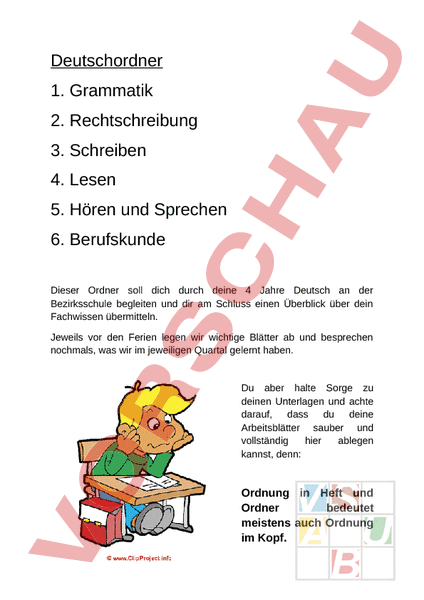 Deutschordner 1. Grammatik 2. Rechtschreibung 3. Schreiben 4. Lesen 5. Hören und Sprechen 6. Berufskunde Dieser Ordner soll dich durch deine 4 Jahre Deutsch an der Bezirksschule begleiten und dir am Schluss einen Überblick über dein Fachwissen übermitteln. Jeweils vor den Ferien legen wir wichtige Blätter ab und besprechen nochmals, was wir im jeweiligen Quartal gelernt haben. Du aber halte Sorge zu deinen Unterlagen und achte darauf, dass du deine Arbeitsblätter sauber und vollständig hier ablegen kannst, denn: Ordnung in Heft und Ordner bedeutet meistens auch Ordnung im Kopf.