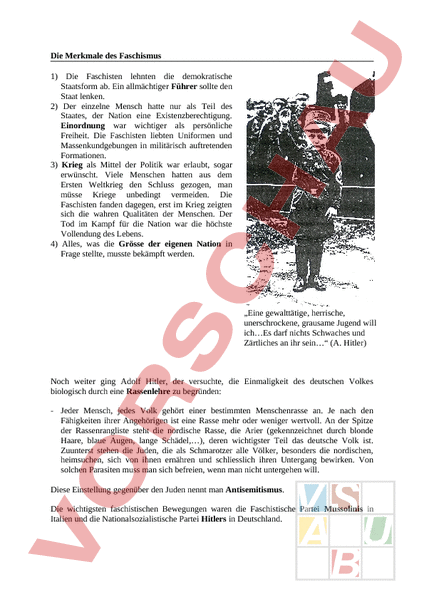 Die Merkmale des Faschismus 1) Die Faschisten lehnten die demokratische Staatsform ab. Ein allmächtiger Führer sollte den Staat lenken. 2) Der einzelne Mensch hatte nur als Teil des Staates, der Nation eine Existenzberechtigung. Einordnung war wichtiger als persönliche Freiheit. Die Faschisten liebten Uniformen und Massenkundgebungen in militärisch auftretenden Formationen. 3) Krieg als Mittel der Politik war erlaubt, sogar erwünscht. Viele Menschen hatten aus dem Ersten Weltkrieg den Schluss gezogen, man müsse Kriege unbedingt vermeiden. Die Faschisten fanden dagegen, erst im Krieg zeigten sich die wahren Qualitäten der Menschen. Der Tod im Kampf für die Nation war die höchste Vollendung des Lebens. 4) Alles, was die Grösse der eigenen Nation in Frage stellte, musste bekämpft werden. „Eine gewalttätige, herrische, unerschrockene, grausame Jugend will ichEs darf nichts Schwaches und Zärtliches an ihr sein (A. Hitler) Noch weiter ging Adolf Hitler, der versuchte, die Einmaligkeit des deutschen Volkes biologisch durch eine Rassenlehre zu begründen: Jeder Mensch, jedes Volk gehört einer bestimmten Menschenrasse an. Je nach den Fähigkeiten ihrer Angehörigen ist eine Rasse mehr oder weniger wertvoll. An der Spitze der Rassenrangliste steht die nordische Rasse, die Arier (gekennzeichnet durch blonde Haare, blaue Augen, lange Schädel,), deren wichtigster Teil das deutsche Volk ist. Zuunterst stehen die Juden, die als Schmarotzer alle Völker, besonders die nordischen, heimsuchen, sich von ihnen ernähren und schliesslich ihren Untergang bewirken. Von solchen Parasiten muss man sich befreien, wenn man nicht untergehen will. Diese Einstellung gegenüber den Juden nennt man Antisemitismus. Die wichtigsten faschistischen Bewegungen waren die Faschistische Partei Mussolinis in Italien und die Nationalsozialistische Partei Hitlers in Deutschland.