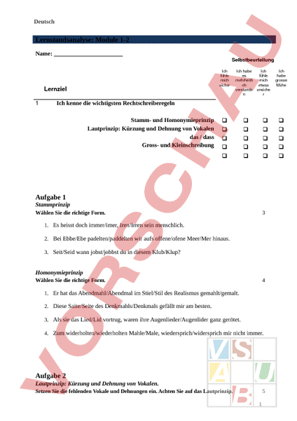 Deutsch Lernstandsanalyse: Module 1-2 Name: Selbstbeurteilung Ich fühle mich sicher Lernziel 1 Ich habe Ich es fühle mehrheitli mich ch etwas verstande unsiche r Ich habe grosse Mühe Ich kenne die wichtigsten Rechtschreiberegeln Stamm- und Homonymieprinzip Lautprinzip: Kürzung und Dehnung von Vokalen das dass Gross- und Kleinschreibung Aufgabe 1 Stammprinzip Wählen Sie die richtige Form. 3 1. Es heisst doch immer/imer, Iren/Irren sein menschlich. 2. Bei Ebbe/Ebe padelten/paddelten wir aufs offene/ofene Meer/Mer hinaus. 3. Seit/Seid wann jobst/jobbst du in diesem Klub/Klup? Homonymieprinzip Wählen Sie die richtige Form. 4 1. Er hat das Abendmahl/Abendmal im Stiel/Stil des Realismus gemahlt/gemalt. 2. Diese Saite/Seite des Denkmahls/Denkmals gefällt mir am besten. 3. Als sie das Lied/Lid vortrug, waren ihre Augenlieder/Augenlider ganz gerötet. 4. Zum widerholten/wiederholten Mahle/Male, wiedersprich/widersprich mir nicht immer. Aufgabe 2 Lautprinzip: Kürzung und Dehnung von Vokalen. Setzen Sie die fehlenden Vokale und Dehnungen ein. Achten Sie auf das Lautprinzip. 5 1 Deutsch 1. Nach der Mlzeit und dem Kaff betrt das Pr den Sl. 2. Sie machte Mi_ne zum bösen Spi_l und trank iren T. 3. Ich ante, dass er sich nimals in die Hle des Lwen wgen würde. 4. Das Bt steckte tf im Mr und wr schon ganz vermst. 5. Schon wrend der Le_re we_rte ich mich gegen di_ses Klisch Aufgabe 3 Lautprinzip Setzen Sie die fehlenden Buchstaben ein. Achten Sie auf das Lautprinzip. 3 1. Nach der enlosen Warterei sah er öllig erzweielt aus. 2. Die alten Eigenossen waren nicht besser als wir. 3. Die schänliche Tat hinterliess noch lange slische Qualen. Aufgabe 3 das oder dass? Setzen Sie „das oder „dass ein. 10 . Vergnügen, . eine achtzigjährige Frau in Fr. an einer Fernsehsendung fand, war so gross, . sie darüber . Apfelmus ganz vergass, . auf ihrem Herd kochte. Zuerst rochen ihre Nachbarn, . da etwas anbrannte; dann sahen sie, . schwärzlicher Qualm aus dem Fenster drang, . ein wenig offen stand. Weder . laute Tatütata, . durch die Strassen hallte, nachdem man sofort die Feuerwehr alarmiert hatte, noch Klopfen und . Rufen der Leute schafften es, . die Frau sich von dem spannenden Bildschirmgeschehen ablenken liess, . sie völlig gefangennahm. Der Feuerwehr blieb nichts anderes übrig, als . Türschloss aufzubrechen. Sehr bald entdeckte einer der Feuerwehrleute, . . übergekochte Apfelmus den Qualm verursachte. Bis dahin hatte die alte Dame alles . nicht bemerkt. . so etwas möglich ist! staunte ein Feuerwehrmann; . muss ja eine tolle Sendung gewesen sein! Aufgabe 4 Gross- und Kleinschreibung Überschreiben Sie wenn nötig mit Grossbuchstaben. 10 2 Deutsch 1. Das nächste mal kommst du früher nach hause. 2. Sehen wir uns morgen abend? 3. Ihr pfeifen hört sich schrecklich an. Also hat sie aufgehört zu pfeifen. 4. Ist das der dank für meine treue? Du hast dank mir die prüfung bestanden. 5. Ist es dir ernst mit deiner drohung? Ja, es ist mein ernst. 6. Es nimmt mich wunder, ob sie kommt. Es wäre wirklich ein wunder! 7. Etwas schöneres hätte ich mir wirklich nicht vorgestellt. 8. Das schönste und grösste geschenk war deine überraschung. 9. In den ferien habe ich etwas verrücktes erlebt. 10. Warst du schon mal an der berliner love-parade? Aufgabe 5 Alle Lernziele Im folgenden Text haben sich 8 Fehler eingeschlichen! 8 Während Sprachhüter und andere Schwarzmahler das ende der Deutschen Schriftsprache prophezeien, reden progresive Sprachforscher und Internetenthusiasten von einer „neuen Schreibkultur, die sich an der Populärsprache und an der Umgangssprache orientirt. So hällt beispielsweise der Germannist Peter Schlobinski von der Universität Hannover, der als Erster die Besonderheiten der Internetsprache untersucht hat, die neuen Ausdrucksformen für zukunftsweisend und bereichernd. 3