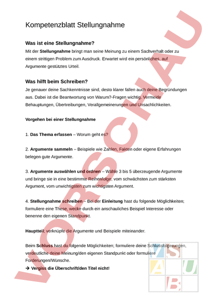 Arbeitsblatt: Stellungnahme Kompetenzblatt