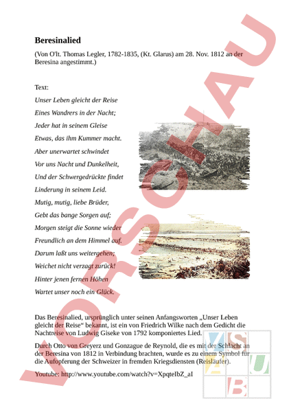 Beresinalied (Von Olt. Thomas Legler, 1782-1835, (Kt. Glarus) am 28. Nov. 1812 an der Beresina angestimmt.) Text: Unser Leben gleicht der Reise Eines Wandrers in der Nacht; Jeder hat in seinem Gleise Etwas, das ihm Kummer macht. Aber unerwartet schwindet Vor uns Nacht und Dunkelheit, Und der Schwergedrückte findet Linderung in seinem Leid. Mutig, mutig, liebe Brüder, Gebt das bange Sorgen auf; Morgen steigt die Sonne wieder Freundlich an dem Himmel auf. Darum laßt uns weitergehen; Weichet nicht verzagt zurück! Hinter jenen fernen Höhen Wartet unser noch ein Glück. Das Beresinalied, ursprünglich unter seinen Anfangsworten „Unser Leben gleicht der Reise bekannt, ist ein von Friedrich Wilke nach dem Gedicht die Nachtreise von Ludwig Giseke von 1792 komponiertes Lied. Durch Otto von Greyerz und Gonzague de Reynold, die es mit der Schlacht an der Beresina von 1812 in Verbindung brachten, wurde es zu einem Symbol für die Aufopferung der Schweizer in fremden Kriegsdiensten (Reisläufer). Youtube: