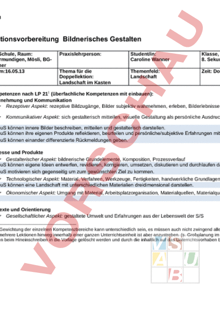 Lektionsvorbereitung Bildnerisches Gestalten Ort, Schule, Raum: Ostermundigen, Mösli, BGZImmer Datum:16.05.13 Praxislehrperson: Student/in: Caroline Wanner Klasse, Niveau: 8. Sekundarstufe Thema für die Doppellektion: Landschaft im Kasten Themenfeld: Landschaft Zeit: Doppellektion m/w: 18 SuS Kompetenzen nach LP 211 (überfachliche Kompetenzen mit einbauen): Wahrnehmung und Kommunikation Rezeptiver Aspekt: rezeptive Bildzugänge, Bilder subjektiv wahrnehmen, erleben, Bilderlebnisse reflektieren Kommunikativer Aspekt: sich gestalterisch mitteilen, visuelle Gestaltung als persönliche Ausdrucksform Die SuS können innere Bilder beschreiben, mitteilen und gestalterisch darstellen. Die SuS können ihre eigenen Produkte reflektieren, beurteilen und persönliche/subjektive Erfahrungen mitteilen. Die SuS können einander differenzierte Rückmeldungen geben. Prozesse und Produkte Gestalterischer Aspekt: bildnerische Grundelemente, Komposition, Prozessverlauf Die SuS können eigene Ideen entwerfen, revidieren, korrigieren, umsetzen, diskutieren und durchlaufen dabei Phasen des kreativen Prozesses Die SuS motivieren sich gegenseitig um zum gewünschten Ziel zu kommen. Technologischer Aspekt: Material, Verfahren, Werkzeuge, Fertigkeiten, handwerkliche Grundlagen Die SuS können eine Landschaft mit unterschiedlichen Materialien dreidimensional darstellen. Ökonomischer Aspekt: Umgang mit Material, Arbeitsplatzorganisation, Materialquellen, Materialqualitäten, Materialbeschaffenheit Kontexte und Orientierung Gesellschaftlicher Aspekt: gestaltete Umwelt und Erfahrungen aus der Lebenswelt der S/S 1Die Gewichtung der einzelnen Kompetenzbereiche kann unterschiedlich sein, es müssen auch nicht zwingend alle Kompetenzbereiche vorkommen. Eine Ausgeglichenheit über mehrere Lektionen hinweg innerhalb einer ganzen Unterrichtseinheit ist aber anzustreben. (s. Grobplanung im FP 2) Die allg. Beschreibungen hinter den Doppelpunkten können beim Hineinschreiben in die Vorlage gelöscht werden und durch die inhaltlich auf das Unterrichtsvorhaben bezogenen Kompetenzformulierungen ersetzt werden. 1 Kultureller Aspekt: Aussagen und Bedeutungen von Bildern/Objekten in verschiedenen Kulturen und Zeiten/Epochen Die SuS können ihre Werke mit anderen Werken vergleichen Persönliche Zielsetzung der Studentin/des Studenten: WIEVIEL? WARUM? WAS? WER TUT WAS? Zeit Phasen Feinziele/Lernziele Warum soll das gelernt werden? Absicht, Sinn, Bedeutung Inhalte in Stichworten Kontextwissen und Informationen a) zum Thema b) zu den bildnerischen Grundelementen c) zu Verfahren in Verbindung mit den Materialien und Werkzeugen Ablauf, Aufbau Lehr- und Lerntätigkeiten (LP SuS) Bildnerische Fragestellungen (ev. rot hervorheben) Aufgabenstellung(en) Die Lernenden SF WIE? WOMIT? Methoden Materialien Werkzeuge Hilfsmittel Medien Was muss bereitgestellt werden? 2 AT 30 .können unterschiedliche Landschaftsbilder nach den raumgestaltenden Kriterien vergleichen Impressionismus, Expressionismus, Surrealismus, Naturalismus - Auslegung unterschiedlicher Landschaftsbilder .experimentieren mit unterschiedlichen Materialien und setzten raumgestaltende Elemente selber um. Dossier mit folgenden Inhalten, welche in der 1. DL erarbeitet wurden dient als Hintergrundwissen: Luftperspektive Farbperspektive Überdeckung Bildgründe Grössenbeziehung Horizont Hell-Dunkel-Verläufe Fluchtpunkt SuS lassen sich von der grossen Auslegeordnung der Lp isnpirieren Wie wirken die unterschiedlichen Materialien aufeinander und miteinander? Offenes Experimentieren, Ausprobieren, Skizzieren, Entwerfen, Anwenden unterschiedlicher Materialien. EA Sa Un Lg Unterschiedlichste Landschaftsbilder, Karton, Schere, Goucachefarben, Watte, Holz, Wasserfarben, Pinsel, Schere usw. - Materialsammlung Experimentieren mit den unterschiedlichen Materialien 3 HT 45 .können sich in der Partnerarbeit einbringen. .können selber Ideen skizzieren. können sich mit ihrem Partner/ ihrer Partnerin über ihre Ideen austauschen. .können sich für eine Idee entscheiden. .können ein genaues Konzept zu ihrem Projekt erstellen. SuS erhalten Auftrag. Lp geht den Auftrag mit den SuS Schritt für Schritt durch und erklärt Beurteilungskriterien und das Konzeptblatt, wie auch den Arbeitsprozessbericht und dessen Handhabung PA Un GnV Exp Dok Konzeptblatt Auftrag Arbeitsprozessbericht Materialien wie oben. Wie entscheiden sie im Team? Absprache mit dem Partner/ der Partnerin Diskutieren Überzeugen Wie skizziere sie gute Ideen? Experimentieren, Bleistift, Skizzenpapier, Erklärungen anbringen. SuS sammeln unterschiedliche Skizzen Wie erstellen sie ein gutes Konzept? SuS füllen vorbereitetes Konzeptblatt aus und ergänzen es mit der geltenden Skizze. Wie kann ich eine Fläche räumlich darstellen? Wie kann ich Fläche und Modellraum verbinden, damit eine Raumtiefe entsteht? SuS experimentieren mit den Materialien und skizzieren ihre Ideen und die raumgestaltenden Elemente. Die SuS beschreiben die gewählten raumgestaltenden Elemente in ihrem Konzept. 4 ST 15 .können ihre Arbeit reflektieren. .können anderen SuS konstruktive Rückmeldungen geben. .können ihren Arbeitsplatz richtig aufräumen. Wie gebe sie den anderen Gruppen gute Rückmeldungen? Die SuS begutachten von einer andern Gruppe das Konzept und geben dazu spezifische Rückmeldungen und Verbeserungsvorschläge. GA Wie reflektieren sie ihren Arbeitsprozess? Die SuS füllen den Arbeitsprozessbericht aus. EA Dok Konzepte Arbeitsprozessbericht Die SuS räumen ihren Arbeitsplatz sauber und ordentlich auf. Lp macht eine kurze Vorschau auf das weitere Vorgehen Hausaufgaben: SuS bringen fehlende Materialien zur Umsetzungen ihres Konzeptes mit. Wie weiter? Phasen: AT Anfangsteil, HT Hauptteil, ST Schlussteil Sozialformen: Plenum, EA Einzelarbeit, PA Partnerarbeit, GA Gruppenarbeit Methoden: a) Allgemeindidaktische Methoden: Vortrag, LL Lern-/Lehrgespräch, Diskussion, ST Stationenarbeit, WS Werkstatt, Projekt (oder projektartig), aL ausserschulische