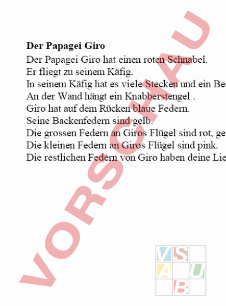 Der Papagei Giro Der Papagei Giro hat einen roten Schnabel. Er fliegt zu seinem Käfig. In seinem Käfig hat es viele Stecken und ein Becken mit Wasser. An der Wand hängt ein Knabberstengel Giro hat auf dem Rücken blaue Federn. Seine Backenfedern sind gelb. Die grossen Federn an Giros Flügel sind rot, gelb, orange, grün und blau. Die kleinen Federn an Giros Flügel sind pink. Die restlichen Federn von Giro haben deine Lieblingsfarbe.