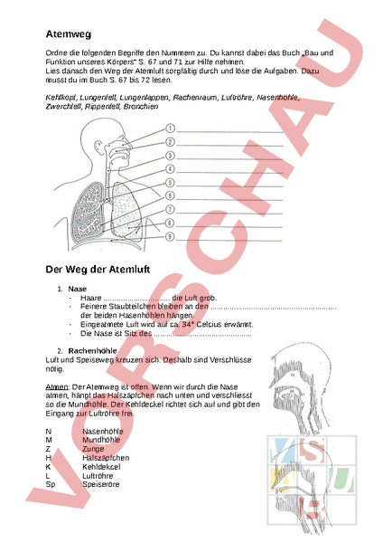 Atemweg Ordne die folgenden Begriffe den Nummern zu. Du kannst dabei das Buch „Bau und Funktion unseres Körpers S. 67 und 71 zur Hilfe nehmen. Lies danach den Weg der Atemluft sorgfältig durch und löse die Aufgaben. Dazu musst du im Buch S. 67 bis 72 lesen. Kehlkopf, Lungenfell, Lungenlappen, Rachenraum, Luftröhre, Nasenhöhle, Zwerchfell, Rippenfell, Bronchien Der Weg der Atemluft 1. Nase Haare . die Luft grob. Feinere Staubteilchen bleiben an den . der beiden Hasenhöhlen hängen. Eingeatmete Luft wird auf ca. 34 Celcius erwärmt. Die Nase ist Sitz des 2. Rachenhöhle Luft und Speiseweg kreuzen sich. Deshalb sind Verschlüsse nötig. Atmen: Der Atemweg ist offen. Wenn wir durch die Nase atmen, hängt das Halszäpfchen nach unten und verschliesst so die Mundhöhle. Der Kehldeckel richtet sich auf und gibt den Eingang zur Luftröhre frei. M H L Sp Nasenhöhle Mundhöhle Zunge Halszäpfchen Kehldekcel Luftröhre Speiseröre Schlucken: Der Speiseweg ist offen. Beim Schlucken verschliesst das Halszäpfchen automatisch die Nasenhöhle, und der Kehldeckel legt sich über die sich nach oben schiebende Luftröhre. 3. Kehlkopf Ordne den Strichen die richtige Nummer zu. 1. Kehldeckel (verschliesst die Luftröhre beim Schlucken). 2. Schildknorpel 3. Adamsapfel 4. Luftröhre 5. Knorpelspange Der Kehlkopf dient der . und dem Verschluss der Bei den . ist der Schildknorpel grösser und stärker und steht als Adamsapfel vor. Das ist nötig, damit die 18mm langen Stimmbänder Platz haben. Frauen haben 6mm . Stimmbänder. Kurze Stimmbänder erzeugen Töne. Werden die Stimmbänder durch stärker gespannt, schwingen sie und erzeugen . Töne. 4. Luftröhre . cm langer, elastischer Schlauch auf der Innenseite befindet sich eine . mit , die kleine Verunreinigungen nach aussen befördern. 5. Bronchien Die Luftröhre teilt sich in zwei Hauptäste, die beiden Bronchien, die je in einen . führen. Die Bronchien verästeln sich bis zu feinsten Zweigen, an deren Ende immer eine Traube von steht. beide Lungenflügel zusammen enthalten ca. . Bläschen. Sie haben einen Durchmesser von Die Gesamtfläche der Lungenbläschen beträgt (ungefähr so viel wie unser Schulzimmer!!) Ordne der Legende die Nummern zu. Bronchien-Endverzweigung Blutgefässe mit kohlendioxidhaltigem Blut. Lungenbläschen Kapillaren für den Gasaustausch Blutgefässe mit sauerstoffreichem Blut