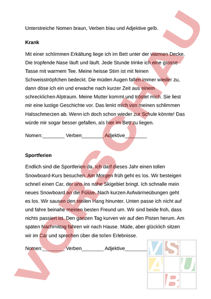 Unterstreiche Nomen braun, Verben blau und Adjektive gelb. Krank Mit einer schlimmen Erkältung liege ich im Bett unter der warmen Decke. Die tropfende Nase läuft und läuft. Jede Stunde trinke ich eine grosse Tasse mit warmem Tee. Meine heisse Stirn ist mit feinen Schweisströpfchen bedeckt. Die müden Augen fallen immer wieder zu, dann döse ich ein und erwache nach kurzer Zeit aus einem schrecklichen Alptraum. Meine Mutter kommt und tröstet mich. Sie liest mir eine lustige Geschichte vor. Das lenkt mich von meinen schlimmen Halsschmerzen ab. Wenn ich doch schon wieder zur Schule könnte! Das würde mir sogar besser gefallen, als hier im Bett zu liegen. Nomen: Verben Adjektive Sportferien Endlich sind die Sportferien da. Ich darf dieses Jahr einen tollen Snowboard-Kurs besuchen. Am Morgen früh geht es los. Wir besteigen schnell einen Car, der uns ins nahe Skigebiet bringt. Ich schnalle mein neues Snowboard an die Füsse. Nach kurzen Aufwärmeübungen geht es los. Wir sausen den steilen Hang hinunter. Unten passe ich nicht auf und fahre beinahe meinen besten Freund um. Wir sind beide froh, dass nichts passiert ist. Den ganzen Tag kurven wir auf den Pisten herum. Am späten Nachmittag fahren wir nach Hause. Müde, aber glücklich sitzen wir im Car und sprechen über die tollen Erlebnisse. Nomen: Verben Adjektive Unterstreiche Nomen braun, Verben blau und Adjektive gelb. Frühling Endlich schmilzt der letzte Schnee. Die ersten Frühlingsblumen strecken ihre Knospen aus der Erde hinaus. Die Vögel beginnen zu pfeifen. Auf unserem Balkon haben wir einen Nistkasten für Meisen. Gestern habe ich zwei Vögel gesehen. Jetzt bin ich natürlich gespannt, ob sie brüten werden. Oft stehe ich versteckt hinter dem Vorhang und beobachte den Nistkasten. Die Tage werden wieder länger und wir können nach dem Nachtessen nochmals hinaus. Meine Freunde und ich spielen auf der Wiese hinter unserem Haus. Mir gefällt diese Jahreszeit, wenn die Tage wieder länger werden. Nomen: Verben Adjektive Meine liebste Freizeitbeschäftigung Wenn ich frei habe, lege ich mich am liebsten auf mein Bett und stecke meine Nase in Bücher hinein. Ich liebe Lesen über alles. Sehr gerne habe ich Abenteuerbücher. Dann versetze ich mich in die Person, die alle diese Abenteuer erlebt. Ich lese und vergesse die Welt um mich herum. Meine Freunde begreifen mich manchmal nicht. Sie spielen lieber draussen auf dem Fussballfeld, während ich in die Bibliothek gehe und mir neue Bücher zusammensuche. Abends muss ich immer aufpassen, dass mich meine Mutter nicht erwischt, wenn ich noch lange lese. Sobald ich höre, dass sie sich meinem Zimmer nähert, lösche ich schnell das Licht und hoffe, dass sie nichts gemerkt hat. Sobald sie wieder im Wohnzimmer verschwunden ist, lese ich weiter. Nomen: Verben Adjektive