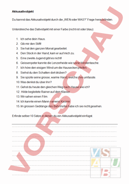 Akkusativobjekt Du kannst das Akkusativobjekt durch die „WEN oder WAS? Frage herausfinden. Unterstreiche das Dativobjekt mit einer Farbe (nicht rot oder blau): 1. Ich sehe dein Haus. 2. Gib mir den Stift! 3. Sie hat den ganzen Monat gearbeitet. 4. Den Stock in der Hand, kam er auf mich zu. 5. Eine zweite Jugend gibt es nicht! 6. Geissenpeter kannte die Lenzerheide wie seine Westentasche. 7. Ich höre den eisigen Wind um die Hausecken pfeifen. 8. Siehst du den Schatten dort drüben? 9. Sie spürte seine grosse, warme Hand, welche ihre umfasste. 10. Was denkst du über ihn? 11. Gehst du heute den gleichen Weg nach Hause wie ich? 12. Hilde begleitete Rainer auf dem Klavier. 13. Wir sahen einen Film. 14. Ich kannte einen Mann namens Kasimir. 15. Im grossen Gedränge des Bahnhofes habe ich sie nicht gesehen. Erfinde selber 10 Sätze in denen du ein Akkusativobjekt einfügst. . . . . . . . . . . .