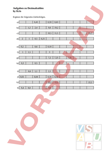 Aufgaben zu Dezimalzahlen by Kris Ergänze die folgenden Zahlenfolgen. a) 1,2 b) 0,45 0,59 0,63 2,4 9,6 19,2 10,5 11,5 c) d) 2 e) 0,2 f) 1 1 0,5 0,6 1,5 0,10 7,2 0,3 j) 0,01 k) 9,4 7,25 7,35 0,5 0,6 i) l) 0,25 3 g) h) 16,5 9,0 1,1 2,1 0,04 0,16 0,32 10,2 12,2 7,8 22,2