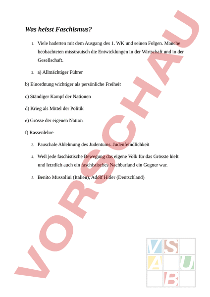 Was heisst Faschismus? 1. Viele haderten mit dem Ausgang des 1. WK und seinen Folgen. Manche beobachteten misstrauisch die Entwicklungen in der Wirtschaft und in der Gesellschaft. 2. a) Allmächtiger Führer b) Einordnung wichtiger als persönliche Freiheit c) Ständiger Kampf der Nationen d) Krieg als Mittel der Politik e) Grösse der eigenen Nation f) Rassenlehre 3. Pauschale Ablehnung des Judentums. Judenfeindlichkeit 4. Weil jede faschistische Bewegung das eigene Volk für das Grösste hielt und letztlich auch ein faschistisches Nachbarland ein Gegner war. 5. Benito Mussolini (Italien), Adolf Hitler (Deutschland)