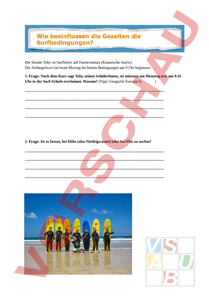 Der blonde Toby ist Surflehrer auf Fuerteventura (Kanarische Inseln). Der Anfängerkurs hat heute Montag bei besten Bedingungen um 9 Uhr begonnen. 1. Frage: Nach dem Kurs sagt Toby seinen SchülerInnen, sie müssten am Dienstag erst um 9.45 Uhr in der Surf-Schule erscheinen. Warum? (Tipp: Geografie Europas S. 2. Frage: Ist es besser, bei Ebbe (also Niedrigwasser) oder bei Flut zu surfen?