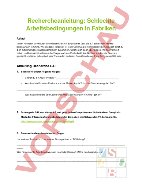 Rechercheanleitung: Schlechte Arbeitsbedingungen in Fabriken Ablauf: In den nächsten 20 Minuten informierst du dich in Einzelarbeit über die z.T. schlechten Arbeits bedingungen in China. Wie du dabei vorgehst, ist in der Anleitung (unten) beschreiben. Danach setzt du dich mit denjenigen Klassenkameraden zusammen, welche sich auch über dieses Thema informiert haben und besprichst mit ihnen die Fragen auf dem Postenblatt. Am Schluss werden die Gruppen gemischt und jeder präsentiert sein Thema den anderen. Das AB sollte am Ende fertig ausgefüllt sein. Anleitung Recherche EA: 1. Beantworte zuerst folgende Fragen: Besitzt du ein AppleProdukt? Was hast du für einen Eindruck von der Marke „Apple? Hat die Firma einen guten Ruf? Was hast du bereits über „schlechte Arbeitsbedingungen in China gehört? 2. Schnapp dir Stift und dieses AB und gehe in den Computerraum. Schalte einen Compi ein. Mach das Internet auf und gebe folgenden Link oben ein: Schaue den TVBeitrag fertig. 3. Beantworte die untenstehenden Fragen: Um welches Produkt und um welche Firma geht es im TVBeitrag? Was für schlechte Arbeitsbedingungen nennt der Beitrag? (Zähle min.3 Aspekte auf) Wieso wehren sich nur wenige ArbeiterInnen gegen ihren Arbeitgeber? 4. Nach 30 Minuten treffen wir uns wieder im Klassenzimmer.