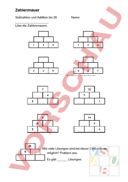 Zahlenmauer Subtraktion und Addition bis 20 Löse die Zahlenmauern. Name: Wie viele Lösungen sind bei dieser Zahlenmauer möglich? Probiere aus. Es gibt Lösungen.