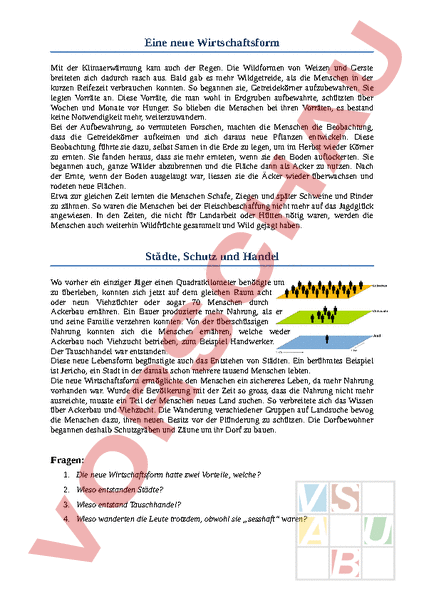 Eine neue Wirtschaftsform Mit der Klimaerwärmung kam auch der Regen. Die Wildformen von Weizen und Gerste breiteten sich dadurch rasch aus. Bald gab es mehr Wildgetreide, als die Menschen in der kurzen Reifezeit verbrauchen konnten. So begannen sie, Getreidekörner aufzubewahren. Sie legten Vorräte an. Diese Vorräte, die man wohl in Erdgruben aufbewahrte, schützten über Wochen und Monate vor Hunger. So blieben die Menschen bei ihren Vorräten, es bestand keine Notwendigkeit mehr, weiterzuwandern. Bei der Aufbewahrung, so vermuteten Forschen, machten die Menschen die Beobachtung, dass die Getreidekörner aufkeimen und sich daraus neue Pflanzen entwickeln. Diese Beobachtung führte sie dazu, selbst Samen in die Erde zu legen, um im Herbst wieder Körner zu ernten. Sie fanden heraus, dass sie mehr ernteten, wenn sie den Boden auflockerten. Sie begannen auch, ganze Wälder abzubrennen und die Fläche dann als Acker zu nutzen. Nach der Ernte, wenn der Boden ausgelaugt war, liessen sie die Äcker wieder überwachsen und rodeten neue Flächen. Etwa zur gleichen Zeit lernten die Menschen Schafe, Ziegen und später Schweine und Rinder zu zähmen. So waren die Menschen bei der Fleischbeschaffung nicht mehr auf das Jagdglück angewiesen. In den Zeiten, die nicht für Landarbeit oder Hütten nötig waren, werden die Menschen auch weiterhin Wildfrüchte gesammelt und Wild gejagt haben. Städte, Schutz und Handel Wo vorher ein einziger Jäger einen Quadratkilometer benötigte um zu überleben, konnten sich jetzt auf dem gleichen Raum acht oder neun Viehzüchter oder sogar 70 Menschen durch Ackerbau ernähren. Ein Bauer produzierte mehr Nahrung, als er und seine Familie verzehren konnten. Von der überschüssigen Nahrung konnten sich die Menschen ernähren, welche weder Ackerbau noch Viehzucht betrieben, zum Beispiel Handwerker. Der Tauschhandel war entstanden. Diese neue Lebensform begünstigte auch das Entstehen von Städten. Ein berühmtes Beispiel ist Jericho, ein Stadt in der damals schon mehrere tausend Menschen lebten. Die neue Wirtschaftsform ermöglichte den Menschen ein sichereres Leben, da mehr Nahrung vorhanden war. Wurde die Bevölkerung mit der Zeit so gross, dass die Nahrung nicht mehr ausreichte, musste ein Teil der Menschen neues Land suchen. So verbreitete sich das Wissen über Ackerbau und Viehzucht. Die Wanderung verschiedener Gruppen auf Landsuche bewog die Menschen dazu, ihren neuen Besitz vor der Plünderung zu schützen. Die Dorfbewohner begannen deshalb Schutzgräben und Zäune um ihr Dorf zu bauen. Fragen: 1. Die neue Wirtschaftsform hatte zwei Vorteile, welche? 2. Wieso entstanden Städte? 3. Wieso entstand Tauschhandel? 4. Wieso wanderten die Leute trotzdem, obwohl sie „sesshaft waren?