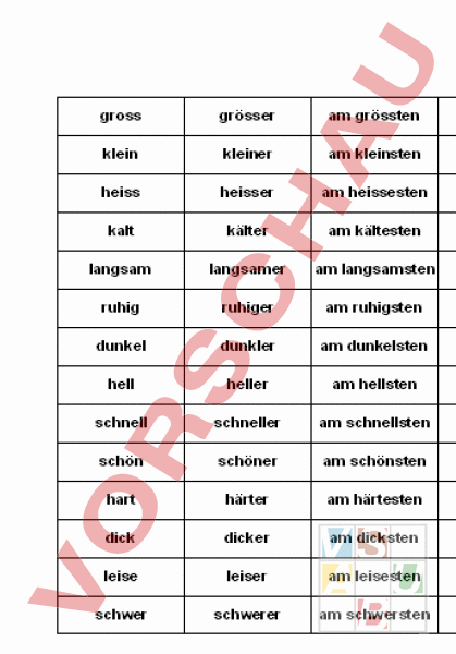 gross grösser am grössten hoch höher am höchsten klein kleiner am kleinsten rund runder am rundesten heiss heisser am heissesten lang länger am längsten kalt kälter am kältesten kurz kürzer am kürzesten langsam langsamer am langsamsten alt älter am ältesten ruhig ruhiger am ruhigsten jung jünger am jüngsten dunkel dunkler am dunkelsten gut besser am besten hell heller am hellsten lustig lustiger am lustigsten schnell schneller am schnellsten traurig trauriger am traurigsten schön schöner am schönsten weich weicher am weichsten hart härter am härtesten dünn dünner am dünnsten dick dicker am dicksten laut lauter am lautesten leise leiser am leisesten süss süsser am süssesten schwer schwerer am schwersten stark stärker am stärksten