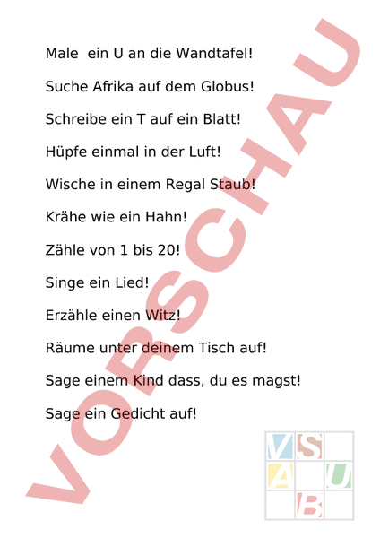 Male ein an die Wandtafel! Suche Afrika auf dem Globus! Schreibe ein auf ein Blatt! Hüpfe einmal in der Luft! Wische in einem Regal Staub! Krähe wie ein Hahn! Zähle von 1 bis 20! Singe ein Lied! Erzähle einen Witz! Räume unter deinem Tisch auf! Sage einem Kind dass, du es magst! Sage ein Gedicht auf! Male dein Traumauto! Suche Liechtenstein im Atlos! Suche Australien auf der Weltkugel! Male dein Lieblingstier an die Wandtafel! Schreibe eine Reihe auf deine Tafel! Spitze deine Farben im Etui! Stell halb 10 auf der Uhr ein! Stell die Uhr auf Mitternacht! Zähle von 1 bis 20 rückwärts! Schüttle einem Freund die Hand! Sag Guten Morgen! Geh und Trinke Wasser!