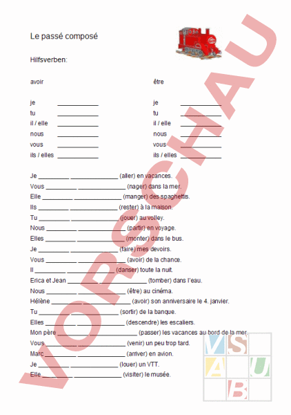 Le passé composé Hilfsverben: avoir être je je tu tu il elle il elle nous nous vous vous ils elles ils elles Je (aller) en vacances. Vous (nager) dans la mer. Elle (manger) des spaghettis. Ils (rester) à la maison. Tu (jouer) au volley. Nous (partir) en voyage. Elles (monter) dans le bus. Je (faire) mes devoirs. Vous (avoir) de la chance. Il (danser) toute la nuit. Erica et Jean (tomber) dans leau. Nous (être) au cinéma. Hélène (avoir) son anniversaire le 4. janvier. Tu (sortir) de la banque. Elles (descendre) les escaliers. Mon père (passer) les vacances au bord de la mer. Vous (venir) un peu trop tard. Marc (arriver) en avion. Je (louer) un VTT. Elle (visiter) le musée.