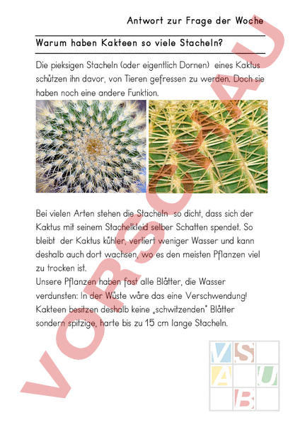 Antwort zur Frage der Woche Warum haben Kakteen so viele Stacheln? Die pieksigen Stacheln (oder eigentlich Dornen) eines Kaktus schützen ihn davor, von Tieren gefressen zu werden. Doch sie haben noch eine andere Funktion. Bei vielen Arten stehen die Stacheln so dicht, dass sich der Kaktus mit seinem Stachelkleid selber Schatten spendet. So bleibt der Kaktus kühler, verliert weniger Wasser und kann deshalb auch dort wachsen, wo es den meisten Pflanzen viel zu trocken ist. Unsere Pflanzen haben fast alle Blätter, die Wasser verdunsten: In der Wüste wäre das eine Verschwendung! Kakteen besitzen deshalb keine „schwitzenden Blätter sondern spitzige, harte bis zu 15 cm lange Stacheln.