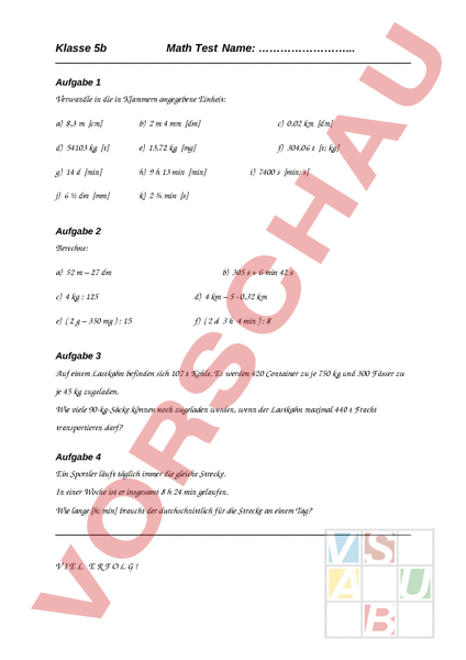 Klasse 5b Math Test Name: . Aufgabe 1 Verwandle in die in Klammern angegebene Einheit: a) 8,3 [cm] b) 2 4 mm [dm] c) 0,02 km [dm] d) 54103 kg [t] e) 13,72 kg [mg] f) 304,06 [t; kg] g) 14 [min] h) 9 13 min [min] j) 6 dm [mm] k) 2 min [s] i) 7400 [min; s] Aufgabe 2 Berechne: a) 52 – 27 dm b) 305 6 min 42 c) 4 kg 125 d) 4 km – 5 0,32 km e) 2 – 350 mg : 15 f) 2 3 4 min : 8 Aufgabe 3 Auf einem Lastkahn befinden sich 107 Kohle. Es werden 420 Container zu je 750 kg und 300 Fässer zu je 45 kg zugeladen. Wie viele 90kgSäcke können noch zugeladen werden, wenn der Lastkahn maximal 440 Fracht transportieren darf? Aufgabe 4 Ein Sportler läuft täglich immer die gleiche Strecke. In einer Woche ist er insgesamt 8 24 min gelaufen. Wie lange [h; min] braucht der durchschnittlich für die Strecke an einem Tag? VIEL ERFOLG!