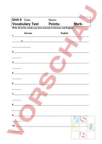 Unit 4 Date: Vocabulary Test Name: Points: Mark: Write 20 of the words you have learned in German and English:. German English 1 2 3 4 5 6 7 8 9 10_ 11_ 12_ 13_ 14_ 15_ 16_ 17_ 18_ 19_ 20_