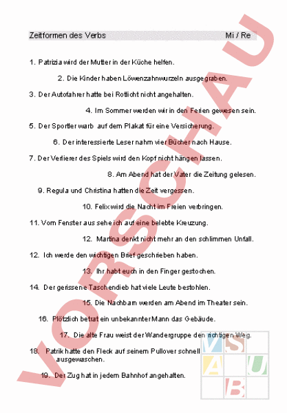 Zeitformen des Verbs Mi Re 1. Patrizia wird der Mutter in der Küche helfen. 2. Die Kinder haben Löwenzahnwurzeln ausgegraben. 3. Der Autofahrer hatte bei Rotlicht nicht angehalten. 4. Im Sommer werden wir in den Ferien gewesen sein. 5. Der Sportler warb auf dem Plakat für eine Versicherung. 6. Der interessierte Leser nahm vier Bücher nach Hause. 7. Der Verlierer des Spiels wird den Kopf nicht hängen lassen. 8. Am Abend hat der Vater die Zeitung gelesen. 9. Regula und Christina hatten die Zeit vergessen. 10. Felix wird die Nacht im Freien verbringen. 11. Vom Fenster aus sehe ich auf eine belebte Kreuzung. 12. Martina denkt nicht mehr an den schlimmen Unfall. 12. Ich werde den wichtigen Brief geschrieben haben. 13. Ihr habt euch in den Finger gestochen. 14. Der gerissene Taschendieb hat viele Leute bestohlen. 15. Die Nachbarn werden am Abend im Theater sein. 16. Plötzlich betrat ein unbekannter Mann das Gebäude. 17. Die alte Frau weist der Wandergruppe den richtigen Weg. 18. Patrik hatte den Fleck auf seinem Pullover schnell ausgewaschen. 19. Der Zug hat in jedem Bahnhof angehalten. Zeitformen des Verbs Patrizia hilft der Mutter in der Küche. Die Kinder haben Löwenzahnwurzeln ausgegraben. Der Autofahrer hat bei Rotlicht nicht angehalten. Im Sommer sind wir in den Ferien gewesen Der Sportler warb auf dem Plakat für eine Versicherung. Der interessierte Leser nahm vier Bücher nach Hause. Der Verlierer des Spiels lässt den Kopf nicht hängen. Am Abend hat der Vater die Zeitung gelesen. Regula und Christina haben die Zeit vergessen. Felix verbringt die Nacht im Freien. Vom Fenster aus sehe ich auf eine belebte Kreuzung. Martina denkt nicht mehr an den schlimmen Unfall. Ich habe den wichtigen Brief geschrieben. Ihr habt euch in den Finger gestochen. Der gerissene Taschendieb hat viele Leute bestohlen. Die Nachbarn sind am Abend im Theater Plötzlich betrat ein unbekannter Mann das Gebäude. Die alte Frau wies der Wandergruppe den richtigen Weg. Patrik hat den Fleck auf seinem Pullover schnell ausgewaschen. Der Zug hat in jedem Bahnhof angehalten. Mi