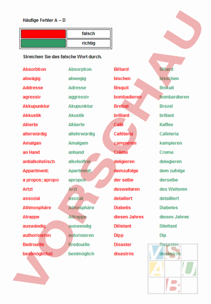 Häufige Fehler – falsch richtig Streichen Sie das falsche Wort durch. Absorbtion Absorption Billiard Billard abwägig abwegig bischen bisschen Addresse Adresse Bisquit Biskuit agressiv aggressiv bombadieren bombardieren Akkupunktur Akupunktur Bretzel Brezel Akkustik Akustik brilliant brillant Allierte Alliierte Café Kaffee alterwürdig altehrwürdig Caféteria Cafeteria Amalgan Amalgam campieren kampieren an Hand anhand Crème Creme antialkoholisch alkoholfrei deligieren delegieren Appartment; Apartment; demzufolge dem zufolge propos; apropo apropos der selbe derselbe Artzt Arzt desweiteren des Weiteren assozial asozial detailiert detailliert Athmosphäre Atmosphäre Diabetis Diabetes Atrappe Attrappe diesen Jahres dieses Jahres auswändig auswendig Dilletant Dilettant authorisieren autorisieren Dipp Dip Bedrouille Bredouille Disaster Desaster bestmöglichst bestmöglich disaströs desaströs Häufige Fehler – / Lösungsfolie Streichen Sie das falsche Wort durch. Absorbtion Absorption Billiard Billard abwegig abwägig bisschen bischen Adresse Addresse Biskuit Bisquit agressiv aggressiv bombadieren bombardieren Akkupunktur Akupunktur Brezel Bretzel Akustik Akkustik brillant brilliant Alliierte Allierte Kaffee Café altehrwürdig alterwürdig Caféteria Cafeteria Amalgan Amalgam kampieren campieren anhand an Hand Crème Creme antialkoholisch alkoholfrei delegieren deligieren Appartment; Apartment; dem zufolge demzufolge apropos apropo der selbe derselbe Arzt Artzt des Weiteren desweiteren assozial asozial detailliert detailiert Atmosphäre Athmosphäre Diabetis Diabetes Atrappe Attrappe diesen Jahres dieses Jahres auswendig auswändig Dilettant Dilletant autorisieren authorisieren Dip Dipp Bedrouille Bredouille Desaster Disaster bestmöglich bestmöglichst disaströs desaströs Häufige Fehler – / Kopiervorlage Streichen Sie das falsche Wort durch. Absorbtion Absorption Billiard Billard abwegig abwägig bisschen bischen Adresse Addresse Biskuit Bisquit agressiv aggressiv bombadieren bombardieren Akkupunktur Akupunktur Brezel Bretzel Akustik Akkustik brillant brilliant Alliierte Allierte Kaffee Café altehrwürdig alterwürdig Caféteria Cafeteria Amalgan Amalgam kampieren campieren anhand an Hand Crème Creme antialkoholisch alkoholfrei delegieren deligieren Appartment; Apartment; dem zufolge demzufolge apropos apropo der selbe derselbe Arzt Artzt des Weiteren desweiteren assozial asozial detailliert detailiert Atmosphäre Athmosphäre Diabetis Diabetes Atrappe Attrappe diesen Jahres dieses Jahres auswendig auswändig Dilettant Dilletant autorisieren authorisieren Dip Dipp Bedrouille Bredouille Desaster Disaster bestmöglich bestmöglichst disaströs desaströs