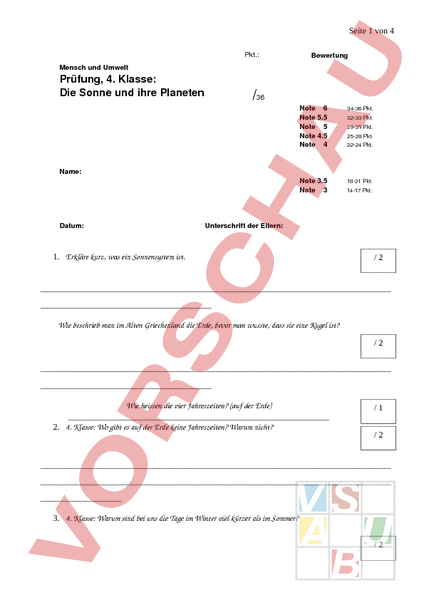 Seite 1 von 4 Pkt.: Bewertung Mensch und Umwelt Prüfung, 4. Klasse: Die Sonne und ihre Planeten /36 Name: Datum: Note 6 Note 5.5 Note 5 Note 4.5 Note 4 3436 Pkt. Note 3.5 Note 3 1821 Pkt. 3233 Pkt. 2931 Pkt. 2528 Pkt. 2224 Pkt. 1417 Pkt. Unterschrift der Eltern: 1. Erkläre kurz, was ein Sonnensystem ist. /2 Wie beschrieb man im Alten Griechenland die Erde, bevor man wusste, dass sie eine Kugel ist? /2 Wie heissen die vier Jahreszeiten? (auf der Erde) 2. 4. Klasse: Wo gibt es auf der Erde keine Jahreszeiten? Warum nicht? /1 /2 3. 4. Klasse: Warum sind bei uns die Tage im Winter viel kürzer als im Sommer? /2 Seite 2 von 4 Warum braucht es ein Schaltjahr? /2 /2 4. Nenne zwei Gründe, warum die Erdatmosphäre für uns so wichtig ist. In welcher Reihenfolge stehen die Planeten? Beginne mit dem innersten. ( Sonnennächsten) /2 Beschreibe einen dieser Planeten etwas genauer. (Mache drei Angaben und schreibe auch auf, über welchen du geschrieben hast.) /3 5. 4. Klasse: Was ist der Unterschied zwischen den inneren und den äusseren Planeten unseres /4 Sonnensystems? Wie heissen sie? Fülle die Tabelle aus. Innere Planeten Unterschiede Namen Äussere Planeten Seite 3 von 4 4. Klasse: Welche zwei Kräfte sind dafür verantwortlich, dass die Planeten immer auf der gleichen Umlaufbahn um die Sonne bleiben? /2 Warum gibt es auf der Erde Leben und auf den anderen Planeten unseres Sonnensystems nicht? /2 Welcher Himmelskörper zählt seit 2006 nicht mehr zu den Planeten? Wie heissen Wissenschaftler, die Sterne beobachten, die Raumfahrt und das Planetensystem erforschen? /1 /1 Zeichne eine zunehmende Mondsichel und einen abnehmenden Halbmond. /2 4. Kl. Was ist eine Mondfinsternis? Erkläre. /2 Warum können wir Fernsehprogramme aus anderen Kontinenten empfangen? /1 Kreuze die richtigen Antworten an! Im Sommer sind bei uns die Tage länger als die Nächte. Wir haben Jahreszeiten, weil die Erdachse schräg zur Sonne steht. Die Erdoberfläche besteht zu 17% aus Wasser. Es kann sein, dass ein Planet mehrere Monde hat. /3 Seite 4 von 4 Die Sonne ist etwa fünfmal grösser als die Erde. Der Mond ist kein Planet. Im Weltall gibt es etwa 100 Sonnen. Die Sonne ist ein glühender Gasball. Die Sonne ist aussen viel heisser als innen. Die Sonne braucht 24 Stunden, um einmal um die Erde zu kreisen. Der Asteroidengürtel ist zwischen den Planeten Uranus und Neptun. Die Sonne ist ein Fixstern; sie bewegt sich nicht. Die äusserste, leuchtende Schicht der Sonne heisst Atmosphäre. Die Prüfung war für mich: ogerade richtig oeinfach oschwierig zu schwierig