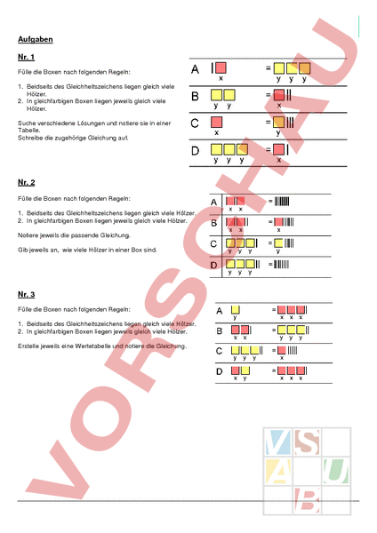 Aufgaben Nr. 1 Fülle die Boxen nach folgenden Regeln: 1. Beidseits des Gleichheitszeichens liegen gleich viele Hölzer. 2. In gleichfarbigen Boxen liegen jeweils gleich viele Hölzer. Suche verschiedene Lösungen und notiere sie in einer Tabelle. Schreibe die zugehörige Gleichung auf. Nr. 2 Fülle die Boxen nach folgenden Regeln: 1. Beidseits des Gleichheitszeichens liegen gleich viele Hölzer. 2. In gleichfarbigen Boxen liegen jeweils gleich viele Hölzer. Notiere jeweils die passende Gleichung. Gib jeweils an, wie viele Hölzer in einer Box sind. Nr. 3 Fülle die Boxen nach folgenden Regeln: 1. Beidseits des Gleichheitszeichens liegen gleich viele Hölzer. 2. In gleichfarbigen Boxen liegen jeweils gleich viele Hölzer. Erstelle jeweils eine Wertetabelle und notiere die Gleichung. Nr. 4 Fülle die Boxen nach folgenden Regeln: 1. Beidseits des Gleichheitszeichens liegen gleich viele Hölzer. 2. In gleichfarbigen Boxen liegen jeweils gleich viele Hölzer. Zeichne zu jeder Wertetabelle die Boxenanordnung und notiere die Gleichung. Es sind verschiedene Lösungen möglich. y 0 3 1 4 2 5 3 6 4 7 5 8 y 5 1 6 3 7 5 8 7 9 9 10 11 y 1 0 3 3 5 6 7 9 9 12 11 15 y 0 10 1 9 2 8 3 7 4 6 5 5 Nr. 5 Jeweils eine Gleichung, eine Tabelle und eine Boxendarstellung beschreiben die gleiche Situation. Welche gehören zusammen? 1 2 3 4 2 2x 2 2y 2x 1 3y 2y 12 y 0 1 2 2 4 3 6 4 y 0 6 2 5 4 4 6 3 y 1 0 2 2 3 4 4 6 y 1 1 4 3 7 5 10 7 Nr. 6 Jeweils eine Gleichung, eine Tabelle und eine Boxendarstellung beschreiben die gleiche Situation. Welche gehören zusammen? 1 2 3 4 2x 1 2x 1 2y 1 xyx1 y 0 1 1 3 2 5 3 7 4 9 y 1 0 3 1 5 2 7 3 9 4 2 3 3 4 4 5 y1 y 0 1 1 2 Nr. 7 Zeichne zu jedem Text eine Boxendarstellung. Notiere dazu Gleichung und Wertetabelle. In der gelben Schachtel liegen 3 Hölzer mehr als in der roten. In der gelben und in der roten Schachtel liegen zusammen 9 Hölzer. In der roten Schachtel liegt ein Hölzchen weniger als in zwei gelben Schachteln zusammen. Nr. 8 Jeweils ein Text, eine Boxendarstellung, eine Gleichung und eine Tabelle beschreiben die gleiche Situation. Welche gehören zusammen? In der gelben Schachtel sind dreimal so viele Hölzchen wie in einer roten. In der roten Schachtel sind drei Hölzchen mehr als in der gelben. In der gelben Schachtel liegen 3 Hölzer mehr als in der roten. II III 1 2 3 xy3 x3y 3x y 3 0 4 1 5 2 6 3 7 4 y 0 0 1 3 2 6 3 9 4 12 y 0 3 1 4 2 5 3 6 4 7 Nr. 9 1 2 3 4 0 2 4 6 1 2 3 4 9 7 5 3 0 1 2 3 1 2 3 4 2x y 11 In einer roten und einer gelben Box zusammen liegt ein Hölzchen mehr als in zwei roten. Lösung Nr. 1 x 1 3y y 2 1 5 2 8 3 11 4 14 5 x 2 2y y 0 1 2 2 4 3 6 4 8 5 xy3 y 3 0 4 1 5 2 6 3 7 4 x 1 3y y 2 1 5 2 8 3 11 4 14 5 Nr. 2 B D 2x 8 2x 1 x 5 3y 1 y 5 3y 2 8 x4 x4 y2 y2 Nr. 3 y 3x 1 y 0 1 1 4 2 7 3 10 4 13 2x 1 3y 2 y 2 1 5 3 8 5 11 7 14 9 3y 2 x 5 y 0 1 3 2 6 3 9 4 12 5 x y 3x 1 y 0 1 1 3 2 5 3 7 4 9 Nr. 4 Nr. 5 Gleichung 1 2 3 4 Wertetabelle A B Boxendarstellung II IV III Nr. 6 Gleichung 1 2 3 4 Wertetabelle A C Boxendarstellung II IV III Nr. 7 0 1 2 3 4 3 4 5 6 7 0 1 2 3 4 9 8 7 6 5 5 1 3 5 7 9 1 2 3 4 5 yx3 xy9 1 2y Nr. 8 III 3x b x 0 1 2 3 4 0 3 6 9 12 1 xy3 II 3 x 3 4 5 6 7 0 1 2 3 4 2 x3y x 0 1 2 3 4 3 4 5 6 7 Nr. 9 1 2 3 4 0 2 4 6 1 2 3 4 9 7 5 3 0 1 2 3 1 2 3 4 2 2x 2x y 11 2x 1 In der gelben Box sind zwei Hölzchen weniger als in zwei roten zusammen. In zwei roten und einer gelben Box zusammen liegen 11 Hölzchen. In einer roten und einer gelben Box zusammen liegt ein Hölzchen mehr als in zwei roten.
