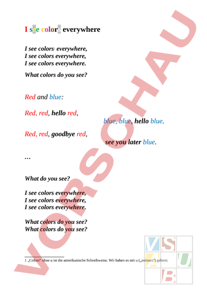I see colors everywhere see colors everywhere, see colors everywhere, see colors everywhere. 1 What colors do you see? Red and blue: Red, red, hello red, blue, blue, hello blue. Red, red, goodbye red, see you later blue. What do you see? see colors everywhere, see colors everywhere, see colors everywhere. What colors do you see? What colors do you see? 1 „Colors ohne ist die amerikanische Schreibweise. Wir haben es mit („colours) gelernt.