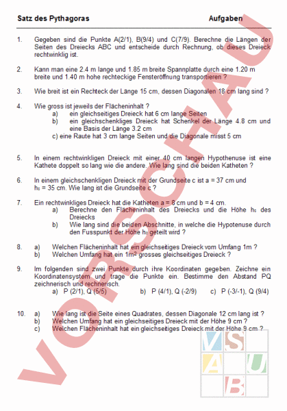 Satz des Pythagoras Aufgaben 1. Gegeben sind die Punkte A(2/1), B(9/4) und C(7/9). Berechne die Längen der Seiten des Dreiecks ABC und entscheide durch Rechnung, ob dieses Dreieck rechtwinklig ist. 2. Kann man eine 2.4 lange und 1.85 breite Spannplatte durch eine 1.20 breite und 1.40 hohe rechteckige Fensteröffnung transportieren 3. Wie breit ist ein Rechteck der Länge 15 cm, dessen Diagonalen 18 cm lang sind 4. Wie gross ist jeweils der Flächeninhalt a) ein gleichseitiges Dreieck hat 6 cm lange Seiten b) ein gleichschenkliges Dreieck hat Schenkel der Länge 4.8 cm und eine Basis der Länge 3.2 cm c) eine Raute hat 3 cm lange Seiten und die Diagonale misst 5 cm 5. In einem rechtwinkligen Dreieck mit einer 40 cm langen Hypothenuse ist eine Kathete doppelt so lang wie die andere. Wie lang sind die beiden Katheten 6. In einem gleichschenkligen Dreieck mit der Grundseite ist 37 cm und hc 35 cm. Wie lang ist die Grundseite ? 7. Ein rechtwinkliges Dreieck hat die Katheten 8 cm und 4 cm. a) Berechne den Flächeninhalt des Dreiecks und die Höhe hc des Dreiecks b) Wie lang sind die beiden Abschnitte, in welche die Hypotenuse durch den Fusspunkt der Höhe hc geteilt wird 8. a) b) 9. Im folgenden sind zwei Punkte durch ihre Koordinaten gegeben. Zeichne ein Koordinatensystem und trage die Punkte ein. Bestimme den Abstand PQ zeichnerisch und rechnerisch. a) (2/1), (5/5) b) (4/1), (-2/9) c) (-3/-1), (9/4) 10. a) b) c) Welchen Flächeninhalt hat ein gleichseitiges Dreieck vom Umfang 1m Welchen Umfang hat ein 1m2 grosses gleichseitiges Dreieck Wie lang ist die Seite eines Quadrates, dessen Diagonale 12 cm lang ist Welchen Umfang hat ein gleichseitiges Dreieck mit der Höhe 9 cm Welchen Flächeninhalt hat ein gleichseitiges Dreieck mit der Höhe 9 cm