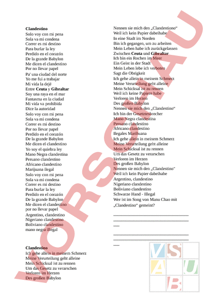 Clandestino Solo voy con mi pena Sola va mi condena Correr es mi destino Para burlar la ley Perdido en el corazón De la grande Babylon Me dicen el clandestino Por no llevar papel Pa una ciudad del norte Yo me fui trabajar Mi vida la dejé Entre Ceuta Gibraltar Soy una raya en el mar Fantasma en la ciudad Mi vida va prohibida Dice la autoridad Solo voy con mi pena Sola va mi condena Correr es mi destino Por no llevar papel Perdido en el corazón De la grande Babylon Me dicen el clandestino Yo soy el quiebra ley Mano Negra clandestina Peruano clandestino Africano clandestino Marijuana ilegal Solo voy con mi pena Sola va mi condena Correr es mi destino Para burlar la ley Perdido en el corazón De la grande Babylon Me dicen el clandestino por no llevar papel Argentino, clandestino Nigeriano clandestino Boliviano clandestino mano negra illegal Clandestino Ich gehe allein in meinem Schmerz Meine Verurteilung geht alleine Mein Schicksal ist zu rennen Um das Gesetz zu verarschen Verloren im Herzen Des großen Babylon Nennen sie mich den „Clandestiono Weil ich kein Papier dabeihabe In eine Stadt im Norden Bin ich gegangen, um zu arbeiten Mein Leben habe ich zurückgelassen Zwischen Ceuta und Gibraltar Ich bin ein Rochen im Meer Ein Geist in der Stadt Mein Leben lebe ich verboten Sagt die Obrigkeit Ich gehe allein in meinem Schmerz Meine Verurteilung geht alleine Mein Schicksal ist zu rennen Weil ich keine Papiere habe Verloren im Herzen Des großen Babylon Nennen sie mich den „Clandestino Ich bin der Gesetztesbrecher Mano Negra clandestina Peruano clandestino Africano clandestino Ilegales Marihuana Ich gehe allein in meinem Schmerz Meine Verurteilung geht alleine Mein Schicksal ist zu rennen Um das Gesetz zu verarschen Verloren im Herzen Des großen Babylon Nennen sie mich den „Clandestino Weil ich kein Papier dabeihabe Argentino, clandestino Nigeriano clandestino Boliviano clandestino Schwarze Hand Illegal Wer ist im Song von Manu Chao mit „Clandestino gemeint? „In eine Stadt im Norden Bin ich gegangen, um zu arbeiten Mein Leben habe ich zurückgelassen Zwischen Ceuta und Gibraltar Im Song von Manu Chao werden die Orte Ceuta und Gibraltar erwähnt. Welche Rolle spielen diese Orte für sogenannte „Clandestinos?