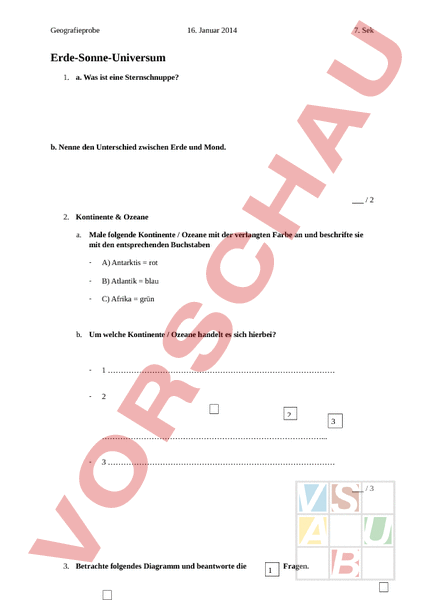 Geografieprobe 16. Januar 2014 7. Sek Erde-Sonne-Universum 1. a. Was ist eine Sternschnuppe? b. Nenne den Unterschied zwischen Erde und Mond. 2 2. Kontinente Ozeane a. Male folgende Kontinente Ozeane mit der verlangten Farbe an und beschrifte sie mit den entsprechenden Buchstaben A) Antarktis rot B) Atlantik blau C) Afrika grün b. Um welche Kontinente Ozeane handelt es sich hierbei? 1 2 2 3 . 3 3 3. Betrachte folgendes Diagramm und beantworte die 1 Fragen. Geografieprobe 16. Januar 2014 7. Sek a. Wie heisst diese Art Diagramm? b. Worum geht es bei diesem Diagramm? c. Was ist die Gesamtaussage des Diagramms? 1.5 4. Erkläre, wie Tag und Nacht entstehen. 1 5. a. Zeichne eine Erde und trage die drei Zonen ein - benenne diese drei Zonen. Geografieprobe 16. Januar 2014 7. Sek b. Wieso wird die Erde in diese drei Zonen eingeteilt? c. Ordne diese Merkmale der entsprechenden Zone zu: Jahreszeiten Sonne steht über dem Zenit tiefe Temperaturen 3 6. Wann beginnt in Australien der Frühling? 0.5 7. Zeichne in die Weltkarte folgende Begriffe und schreibe die entsprechenden Grade ein (Nord, Süd, West, Ost nicht vergessen). a. Äquator rot b. Wendekreise grün c. Nullmeridian blau /1.5 Geografieprobe 16. Januar 2014 7. Sek 8. In Amsterdam ist es 11.00 Uhr am 16. Januar 2014, wie spät ist es in New York und welcher Tag herrscht dort? 0.5 9. In Zweisimmen ist es 22.30 Uhr am 16. Januar 2014 wie spät ist es in Sydney und welcher Tag herrscht dort? 0.5 10. Welcher Ort ist mit folgenden Koordinaten gemeint? 34 / 58 0.5 14