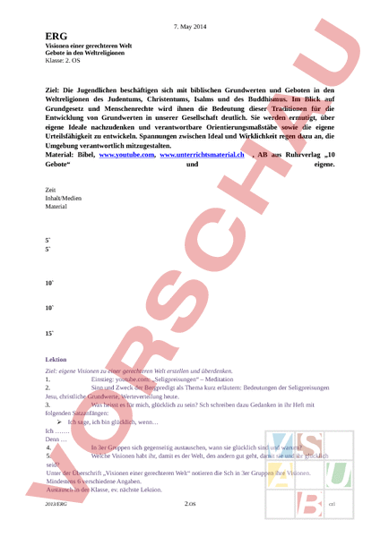 7. May 2014 ERG Visionen einer gerechteren Welt Gebote in den Weltreligionen Klasse: 2. OS Ziel: Die Jugendlichen beschäftigen sich mit biblischen Grundwerten und Geboten in den Weltreligionen des Judentums, Christentums, Isalms und des Buddhismus. Im Blick auf Grundgesetz und Menschenrechte wird ihnen die Bedeutung dieser Traditionen für die Entwicklung von Grundwerten in unserer Gesellschaft deutlich. Sie werden ermutigt, über eigene Ideale nachzudenken und verantwortbare Orientierungsmaßstäbe sowie die eigene Urteilsfähigkeit zu entwickeln. Spannungen zwischen Ideal und Wirklichkeit regen dazu an, die Umgebung verantwortlich mitzugestalten. Material: Bibel, www.youtube.com, www.unterrichtsmaterial.ch AB aus Ruhrverlag „10 Gebote und eigene. Zeit Inhalt/Medien Material 5 5 10 10 15 Lektion Ziel: eigene Visionen zu einer gerechteren Welt erstellen und überdenken. 1. Einstieg: youtube.com: „Seligpreisungen – Meditation 2. Sinn und Zweck der Bergpredigt als Thema kurz erläutern: Bedeutungen der Seligpreisungen Jesu, christliche Grundwerte, Werteverteilung heute. 3. Was heisst es für mich, glücklich zu sein? Sch schreiben dazu Gedanken in ihr Heft mit folgenden Satzanfängen: Ich sage, ich bin glücklich, wenn Ich . Denn 4. In 3er Gruppen sich gegenseitig austauschen, wann sie glücklich sind und warum? 5. Welche Visionen habt ihr, damit es der Welt, den andern gut geht, damit sie und ihr glücklich seid? Unter der Überschrift „Visionen einer gerechteren Welt notieren die Sch in 3er Gruppen ihre Visionen. Mindestens 6 verschiedene Angaben. Austausch in der Klasse, ev. nächste Lektion. 2013/ERG 2.OS czl 7. May 2014 ERG Visionen einer gerechteren Welt Gebote in den Weltreligionen Klasse: 2. OS HA: Titelseite gestalten zu „Visionen einer gerechteren Welt und 3 Zeitungsartikel, in welchen zum Tragen kommt, was diese Visionen einer gerechten Welt eben zerstört. Beamer Film: Meditation Seligpreisungen aus youtube.com 10 20 10 5 Lektion Ziel: Die SuS erkennen, dass Gebote und Verbote fürs friedliche Zusammenleben unter Menschen notwendig sind. 6. HA kontrollieren und diskutieren, was sie tun können, damit die Welt gerechter wird für alle, d.h. konkret in ihrer näheren Umgebung. 7. Die SuS stellen in GA auf einem Plakat eine Liste auf mit 5 Geboten oder Verboten, welche für sie grosse Bedeutung haben, damit das Zusammenleben in ihrer Umgebung (Schule, Familie, Freizeit) gut läuft. An wen richten sich diese Gebote? Was sollen diese Gebote erreichen? Warum sollen wir diese akzeptieren? Vorstellen und Diskussion im Plenum. 8. Sie SuS notieren ins Heft von wem sie sich Regeln, Gebote und Verbote geben lassen (Tabelle ). Anschliessende Diskussion. Eventuell nächste Lektion! Von wem? In welchem Was? Warum? Bereich? 9. Die SuS schreiben die 10 Gebote ins Heft, so wie sie diese kennen, sich an sie erinnern. HA: Zu Hause mindestens drei Personen fragen, welche Gebote für sie die wichtigsten sind. 2013/ERG 2.OS czl 7. May 2014 ERG Visionen einer gerechteren Welt Gebote in den Weltreligionen Klasse: 2. OS 5 15 10 15 Lektion Ziel: Die SuS lernen die Entstehung und Bedeutung im Alltag der 10 Gebote kennen. Sie stellen fest, dass diese in der Bibel an zwei Stellen stehen. Sie können die Gebote mit eigenen Worten formulieren. 10. Wir werten die Angaben der Kurz-Interviews aus: wichtigste Gebote. 11. Wir lesen gemeinsam die Gebote im AT (Ex 20 und Dtn 5). Wir lesen anschliessend die AB zur Entstehung der 10 Gebote. Zusatzinfos der LP. 12. Die SuS schreiben zusätzliche religiöse Gebote und Regeln, die sie kennen ins Heft. (Kulturelle oder traditionelle). Besprechen im Plenum. 13. Die SuS schreiben die 10 Gebote in eigenen Worten in ihr Heft. Sie formulieren in PA, welche Bedeutung die Gebote in ihrem Leben haben. Sie lassen Platz frei, um zu jedem Gebot ein Bild einzukleben. Besprechen im Plenum. HA: Bildcollage zu den Geboten. Bibel Ex 20, 1-17 Dtn 5, 6-22 10 5 10 10 10 Lektion Ziel: Vertonung der 10 Gebote kennen lernen. Vergleich der Gebote mit Geboten aus dem Koran. 14. Bildcollagen in Gruppen gegenseitig vorstellen. 15. Lied: Tote Hosen hören/Kopie des Textes vor sich. Wer will, singt mit. 16. Sch füllen das AB zu „10 Gebote der Toten Hosen aus. 17. Besprechung im Plenum. 2013/ERG 2.OS czl 7. May 2014 ERG Visionen einer gerechteren Welt Gebote in den Weltreligionen Klasse: 2. OS 18. Diskussion im Plenum. Was glaubt ihr, könnte man die Gebote als „Gesetzbuch der Religionen bezeichnen? 19. Vergleich der Gebote mit Geboten im Koran in PA. Auswertung im Plenum. HA: Austeilen der Kopie: 10 Gebote. SuS schreiben zu einem der Gebote entweder ein Gebet oder sonst ein paar Gedanken. HA: beenden des Gebetes. 10 20 15 Lektion Ziel: Die SuS lernen die Bergpredigt kennen. Sie lernen zusätzliche verschärfte Gebote Jesu kennen und setzen sich mit diesen auseinander. 20. Wir erlesen gemeinsam die Bergpredigt, Mt 5 21. Die SuS erarbeiten gemeinsam in GA die Aufträge auf dem AB. LP gibt Hilfestellungen bei Problemen und Fragen. 22. Besprechen der Arbeiten im Plenum. Bibel 5 5 10 10 15 2013/ERG 2.OS czl 7. May 2014 ERG Visionen einer gerechteren Welt Gebote in den Weltreligionen Klasse: 2. OS Lektion Ziel: Die SuS lernen die Vier edlen Wahrheiten des Buddhismus kennen. Sie vergleichen die Lebensweisheiten mit den 10 Geboten. 23. Kurzinput der LP zum Buddhismus 24. Gemeinsames Lesen der Vier edlen Wahrheiten. Als HA kleben die SuS Bilder dazu. 25. Gemeinsames Erarbeiten des achtfachen Pfades. Symbolerklärung des Rades. 26. In PA ordnen die Umschreibungen den Pfaden zu und geben ein Beispiel dazu. Korrektur. 27. In PA verbinden die SuS die zehn Gebote mit dem edlen achtfachen Pfad. Gespräch im Plenum. HA: Bilder suchen und einkleben. Kinderrechte im Internet suchen. 10 35 Lektion Ziel: Die SuS vergleichen die Kinderrechte mit den Geboten in den erarbeiteten Weltreligionen. Im Anschluss erstellen sie eine Wertepyramide mit ihren wichtigsten Geboten. 28. Wir lesen die Kinderrechte. Im P