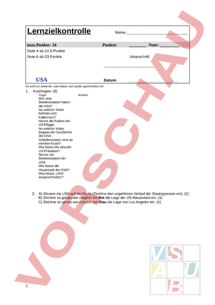 Lernzielkontrolle max.Punkte: 24 Name:_ Punkte: Note 4 ab 14.5 Punkte Note 6 ab 23 Punkte Note: Unterschrift: USA Datum: Es wird nur bewertet, was lesbar und sauber geschrieben ist! 1. Kurzfragen: (8) Frage Antwort Wie viele Bundesstaaten haben die USA? An welcher Küste befindet sich Kalifornien? Nenne die Farben der US-Flagge. An welcher Küste begann die Geschichte der USA Gründerstaaten sind an welcher Küste? Wie heisst der aktuelle US-Präsident? Nenne vier Bundesstaaten der USA. Wie heisst die Hauptstadt der USA? Was heisst „USA ausgeschrieben? 2. A) Situiere die USA auf der Karte (Zeichne den ungefähren Verlauf der Staatsgrenzen ein). (2) B) Zeichne so genau wie möglich mit Rot die Lage der US-Hauptstadt ein. (1) C) Zeichne so genau wie möglich mit Blau die Lage von Los Angeles ein. (1) 1 3. A) Zähle von Osten nach Westen die Landschaftszonen der USA auf. (2) B) Zähle von Süden nach Norden die Klimazonen der USA auf. (2) 4. A) Erkläre den Begriff Verstädterung. (2) B) Zeichne schematisch (inklusive Legende) eine typische US-Grossstadt. (4) 2 5. Was sind die Merkmale einer typischen US-Downtown? (1) 6. Erkläre den Zusammenhang zwischen den USA und der Versorgung der Welt mit Weizen. (1) 3