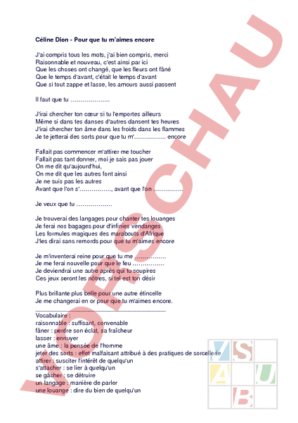 Céline Dion Pour que tu maimes encore Jai compris tous les mots, jai bien compris, merci Raisonnable et nouveau, cest ainsi par ici Que les choses ont changé, que les fleurs ont fâné Que le temps davant, cétait le temps davant Que si tout zappe et lasse, les amours aussi passent Il faut que tu Jirai chercher ton cœur si tu lemportes ailleurs Même si dans tes danses dautres dansent tes heures Jirai chercher ton âme dans les froids dans les flammes Je te jetterai des sorts pour que tu m. encore Fallait pas commencer mattirer me toucher Fallait pas tant donner, moi je sais pas jouer On me dit quaujourdhui, On me dit que les autres font ainsi Je ne suis pas les autres Avant que lon s., avant que lon Je veux que tu Je trouverai des langages pour chanter tes louanges Je ferai nos bagages pour dinfinies vendanges Les formules magiques des marabouts dAfrique Jles dirai sans remords pour que tu maimes encore Je minventerai reine pour que tu me . Je me ferai nouvelle pour que le feu . Je deviendrai une autre après qui tu soupires Ces jeux seront les nôtres, si tel est ton désir Plus brillante plus belle pour une autre étincelle Je me changerai en or pour que tu maimes encore. Vocabulaire raisonnable suffisant, convenable fâner perdre son éclat, sa fraîcheur lasser ennuyer une âme la pensée de lhomme jeter des sorts effet malfaisant attribué à des pratiques de sorcellerie attirer susciter lintérêt de quelquun sattacher se lier à quelquun se gâcher se détruire un langage manière de parler une louange dire du bien de quelquun infini sans limites une vendange récolte du raisin (ici un moment heureux) un marabout saint personnage, un sorcier un remords reproche de la conscience retenir empêcher quelquun de partir une étincelle une petite flamme 2. Expression écrite Écrivez un texte où vous exprimez votre regret à propos dun ami que vous avez perdu à cause de votre comportement. Employez les verbes et les locutions donnés. Je voudrais que tu Afin que Il suffirait que . Il faudrait que . Il faut que Pour que . Avant que . Je veux que .