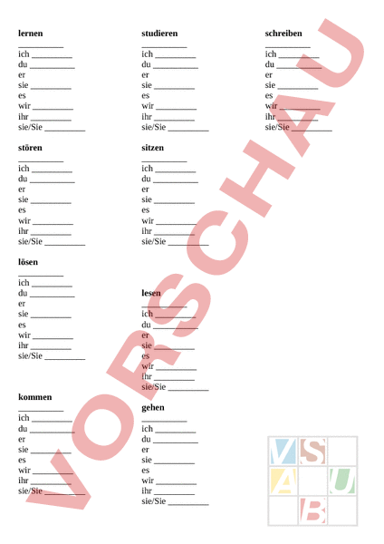 lernen ich du er sie es wir ihr sie/Sie studieren ich du er sie es wir ihr sie/Sie stören ich du er sie es wir ihr sie/Sie sitzen ich du er sie es wir ihr sie/Sie lösen ich du er sie es wir ihr sie/Sie kommen ich du er sie es wir ihr sie/Sie lesen ich du er sie es wir ihr sie/Sie gehen ich du er sie es wir ihr sie/Sie schreiben ich du er sie es wir ihr sie/Sie