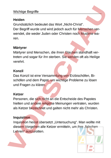 Wichtige Begriffe Heiden Grundsätzlich bedeutet das Wort „Nicht-Christ. Der Begriff wurde und wird jedoch auch für Menschen verwendet, die weder Juden oder Christen noch Muslime waren. Märtyrer Märtyrer sind Menschen, die ihren Glauben standhaft vertreten und sogar für ihn sterben. Sie werden oft als Heilige verehrt. Konzil Das Konzil ist eine Versammlung von Erzbischöfen, Bischöfen und dem Papst, um wichtige Probleme zu lösen und Fragen zu klären. Ketzer Personen, die sich nicht an die Entscheide des Papstes hielten und andere religiöse Meinungen vertraten, wurden als Ketzer bezeichnet und galten nicht mehr als Christen. Inquisition Inquisition heisst übersetzt „Untersuchung. Man wollte mit diesem Vorgehen alle Ketzer ermitteln, um ihre „falschen Lehren auszurotten.