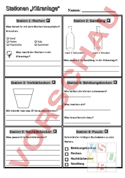 Namen: Station 1: Rechen Station 2: Sandfang Was könnt ihr mit dem Rechen herausholen? Kreuzt an. Sand Fäden Plastikfolie Salz Spülmittel Was macht der Rechen in der nach 2 Sekunden nach 2 Minuten Kläranlage? Was passiert im Sandfang in der Kläranlage? Station 3: Vorklärbecken Station 4: Belebungsbecken Wie heißen die kleinen Lebewesen? Was machen sie? Wie könnte man das Öl herausbekommen? Was brauchen sie dazu? Station 5: Nachklärbecken Was passiert im Nachklärbecken? Station 6: Puzzle Schreibt die richtigen Buchstaben zu den Namen. Belebungsbecken Rechen Nachklärbecken Sandfang Vorklärbecken Station 1 Rechen Ihr braucht: • eine Wanne • ein Drahtgitter • Schmutzwasser mit Sand Spülmittel Fäden Plastikfolie Salz So geht es: Das Drahtgitter ist euer Rechen. Zieht den Rechen durch die Wanne. Welchen Schmutz bekommt ihr heraus? Schreibt auf dem Laufblatt. Macht die Station wieder sauber. Station 2 Sandfang Ihr braucht: • eine Flasche mit Schmutzwasser mit Sand Erde • eine Stoppuhr So geht es: Schüttelt die Flasche. Einer von euch beobachtet und einer stoppt die Zeit. Wie sieht das Wasser nach 2 Sekunden aus? Wie sieht das Wasser nach 2 Minuten aus? Der Sandfang in der Kläranlage besteht aus langen Rinnen. Das Wasser fließt ziemlich schnell durch das Becken. Grobe und schwere Stoffe wie Sand, Kies und Steine setzen sich am Boden ab. Schreibt auf dem Laufblatt. Station 3 Vorklärbecken So geht es: In dem Becher sind Wasser Öl Klopapier Rührt um. Lest hierImweiter. Vorklärbecken fließt das Wasser langsamer. So können sich kleinere Teile vom Wasser trennen. Auf dem Boden sammelt sich Schlamm. Zeichnet auf dem Laufblatt, wie das Wasser im Becher jetzt aussieht. Wo ist das Öl? Wo ist das Klopapier? Beantwortet die Frage auf dem Laufblatt. Station 5 Station 4 Nachklärbecken Belebungsbecken So geht es: Lest euch gegenseitig den Text vor. Jeder liest einen Satz. So geht es: Beantwortet die Fragen auf dem Laufblatt. Lest euch gegenseitig den auf Textdem vor.Laufblatt. Jeder liest einen Satz. Beantwortet die Fragen Im Nachklärbecken Imhaben Belebungsbecken Die Bakterien den Schmutz gefressen. Sie bilden nun einen Schlamm. Bakterien sind kleine Lebewesen. Im Nachklärbecken fließt das Wasser sehen. Man kann sie nur mit dem Mikroskop langsamer. Manche Bakterien können Krankheiten Der Schlamm sinkt auf den Boden. auslösen. Das Abwasser ist nun sauber und wird Manche Bakterien sindziemlich aber auch nützlich. inDie einen Fluss geleitet. Bakterien in der Kläranlage „fressen Schmutzteilchen auf. Sie brauchen dafür viel Sauerstoff. Es entsteht Schlamm. Diesen Schlamm nennt man „Belebtschlamm. Diese Wörter sind L R I Ö R M B S versteckt: P O K B X W I I P D H D K G H Rechen L Ä A L G C N R Sandfang Ü N E N I B T C M Z C V E O V Kläranlage Ö B Ü O B P D Belebungsbecken R S I E U R V Ü Bakterien Ö A I T N T M S R V P B G A O Vorklärbecken B D T P S N Z Abwasser N F O E B N B R B K E I N P Ü Schlamm Legt Puzzle. Ö Wgemeinsam N N das C C N B Pumpe M G Ö R K O M Schreibt die richtigen Buchstaben mit Folienstift auf. P N P M E Z O Rohre J B B I N U V G O M M I I K P O K LBelebungsbecken Ä B C Eführen U viele In das Rohre. Station 6 Puzzle So geht es: Damit wird Sauerstoff in das Becken geleitet. Der Rechen filtert die großen Teile aus dem Abwasser. Er Das Nachklärbecken kommt nach dem ist im ersten Becken der Kläranlage. Belebungsbecken. Hier sinkt der Schlamm auf den Boden. Der Sandfang kommt nach dem Rechen. Das Vorklärbecken kommt vor dem Belebungsbecken. Überlegt, was in den anderen Becken auf dem Bild passiert. Schreibt auf dem Laufblatt.