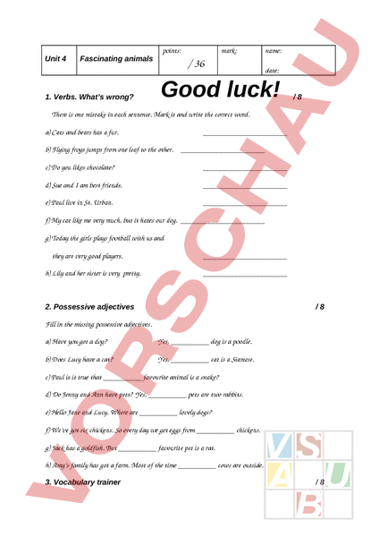 Unit 4 Fascinating animals 1. Verbs. Whats wrong? points: mark: 36 name: date: Good luck! /8 There is one mistake in each sentence. Mark it and write the correct word. a) Cats and bears has fur. b) Flying frogs jumps from one leaf to the other. c) Do you likes chocolate? d) Sue and am best friends. e) Paul live in St. Urban. f) My cat like me very much, but it hates our dog. g) Today the girls plays football with us and they are very good players. h) Lily and her sister is very pretty. 2. Possessive adjectives /8 Fill in the missing possessive adjectives. a) Have you got dog? Yes, dog is poodle. b) Does Lucy have cat? Yes, cat is Siamese. c) Paul is it true that favourite animal is snake? d) Do Jenny and Ann have pets? Yes, pets are two rabbits. e) Hello Jane and Lucy. Where are lovely dogs? f) Weve got six chickens. So every day we get eggs from chickens. g) Jack has goldfish. But favourite pet is rat. h) Amys family has got farm. Most of the time cows are outside. 3. Vocabulary trainer /8 Complete the sentences with the correct words from the box. a) can popcorn. Did you make some? b) have to my room every Saturday. c) My little brother likes to under his bed. d) The new girl doesnt talk much at school. She is very . e) My dog is very hungry. have to him. f) cannot under water, but fish can. g) No two people are like each other. Every person is . h) When people and animals feel , they run away. buy pets loses shy different smell hide breathe danger fur feed tail mouth clean 4. Wordlist 12 a) Write in German. tall dice neighbour pleasure escape roof reisen überall geniessen Blume Brücke früh b) Write in English.