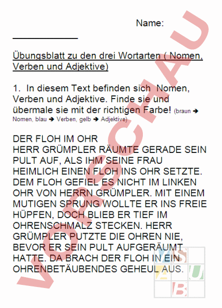 Name: Übungsblatt zu den drei Wortarten Nomen, Verben und Adjektive) 1. In diesem Text befinden sich Nomen, Verben und Adjektive. Finde sie und übermale sie mit der richtigen Farbe! (braun Î Nomen, blau Î Verben, gelb Î Adjektive) DER FLOH IM OHR HERR GRÜMPLER RÄUMTE GERADE SEIN PULT AUF, ALS IHM SEINE FRAU HEIMLICH EINEN FLOH INS OHR SETZTE. DEM FLOH GEFIEL ES NICHT IM LINKEN OHR VON HERRN GRÜMPLER. MIT EINEM MUTIGEN SPRUNG WOLLTE ER INS FREIE HÜPFEN, DOCH BLIEB ER TIEF IM OHRENSCHMALZ STECKEN. HERR GRÜMPLER PUTZTE DIE OHREN NIE, BEVOR ER SEIN PULT AUFGERÄUMT HATTE. DA BRACH DER FLOH IN EIN OHRENBETÄUBENDES GEHEUL AUS. HERR GRÜMPLER KRATZTE SICH NERVÖS HINTER DEN OHREN. DAS OHRENSAUSEN WURDE IMMER UNHEIMLICHER. NATÜRLICH AHNTE ER NICHT, DASSS AUCH DER FRIEDLICHE OHRWURM, DER SICH SONST NUR BEI LÄNDLERMUSIK AUS DEM SCHLAF AUFRAPPELTE, AUFGESCHRECKT WAR UND IN DER RECHTEN OHRTROMMEL ZU KLOPFEN BEGANN. HERR GRÜMPLER WURDE BIS ÜBER BEIDE OHREN ROT, ER VERMOCHTE SICH AUF NICHTS MEHR ZU KONZENTRIEREN. FÜR HEUTE HATTE HERR GRÜMPLER GENUG, ER HAUTE SICH AUFS OHR. 2. Schreibe auf die Rückseite fünf eigene Sätze. Alle Sätze müssen ein Nomen, ein Verb und ein Adjektiv haben! (Ziehe Bleistiftlinien für deine Sätze!) 2.a Male danach die Wortarten mit der richtigen Farbe an! 3. Setze die richtigen Peronsalformen davor! redeten kam wollten Diese Verben stehen im . spiele beugen wirfst Diese Verben stehen im. ranntest stahl tranken Diese Verben stehen im. 4. Welche Adjektive passen zu einem Frosch? Schreibe zu diesem Tier 6 passende Adjektive auf die Zeilen!