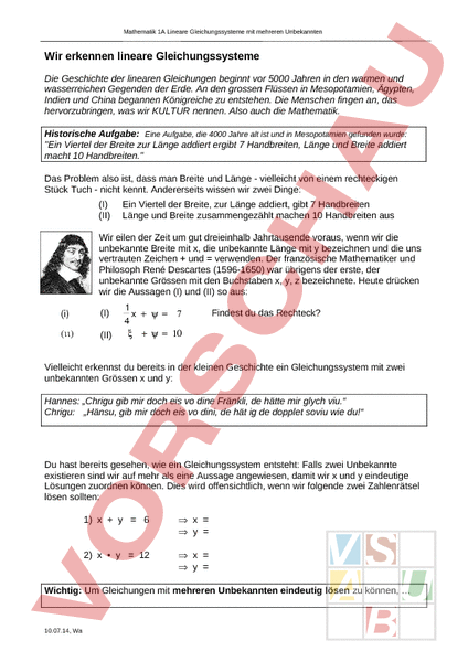 Mathematik 1A Lineare Gleichungssysteme mit mehreren Unbekannten Wir erkennen lineare Gleichungssysteme Die Geschichte der linearen Gleichungen beginnt vor 5000 Jahren in den warmen und wasserreichen Gegenden der Erde. An den grossen Flüssen in Mesopotamien, Ägypten, Indien und China begannen Königreiche zu entstehen. Die Menschen fingen an, das hervorzubringen, was wir KULTUR nennen. Also auch die Mathematik. Historische Aufgabe: Eine Aufgabe, die 4000 Jahre alt ist und in Mesopotamien gefunden wurde: Ein Viertel der Breite zur Länge addiert ergibt 7 Handbreiten, Länge und Breite addiert macht 10 Handbreiten. Das Problem also ist, dass man Breite und Länge vielleicht von einem rechteckigen Stück Tuch nicht kennt. Andererseits wissen wir zwei Dinge: (I) (II) Ein Viertel der Breite, zur Länge addiert, gibt 7 Handbreiten Länge und Breite zusammengezählt machen 10 Handbreiten aus Wir eilen der Zeit um gut dreieinhalb Jahrtausende voraus, wenn wir die unbekannte Breite mit x, die unbekannte Länge mit bezeichnen und die uns vertrauten Zeichen und verwenden. Der französische Mathematiker und Philosoph René Descartes (1596-1650) war übrigens der erste, der unbekannte Grössen mit den Buchstaben x, y, bezeichnete. Heute drücken wir die Aussagen (I) und (II) so aus: (i) (I) () (II) 1 7 4 10 Findest du das Rechteck? Vielleicht erkennst du bereits in der kleinen Geschichte ein Gleichungssystem mit zwei unbekannten Grössen und y: Hannes: „Chrigu gib mir doch eis vo dine Fränkli, de hätte mir glych viu. Chrigu: „Hänsu, gib mir doch eis vo dini, de hät ig de dopplet soviu wie du! Du hast bereits gesehen, wie ein Gleichungssystem entsteht: Falls zwei Unbekannte existieren sind wir auf mehr als eine Aussage angewiesen, damit wir und eindeutige Lösungen zuordnen können. Dies wird offensichtlich, wenn wir folgende zwei Zahlenrätsel lösen sollten: 1) 6 2) • 12 Wichtig: Um Gleichungen mit mehreren Unbekannten eindeutig lösen zu können, 10.07.14, Wa Mathematik 1A Lineare Gleichungssysteme mit mehreren Unbekannten 10.07.14, Wa Mathematik 1A Lineare Gleichungssysteme mit mehreren Unbekannten Gleichungssysteme können mit verschiedenen Verfahren gelöst werden Gelingt es dir, selbständig die zwei Beispiele zu lösen, ohne unten die Verfahren zu studieren? Notiere der Reihe nach, welche Überlegungsschritte sich ergeben: 1) 26 8 2) 4 x 5 5 x 2 Beim Lösen aller Gleichungssysteme geht es darum, möglichst rasch nur eine Gleichung mit einer Unbekannten zu gewinnen, nach der anschliessend die Gleichung aufgelöst werden kann. Diese Lösung kann in eine andere Gleichung eingesetzt und so eine weitere unbekannte Variable gelöst werden. Substituieren oder Einsetzen Das Einsetzverfahren eignet sich besonders, wenn eine der Gleichungen nach einer Variablen aufgelöst ist oder einfach umgeformt werden kann. Jetzt kann dieser Term in der anderen Gleichung anstelle dieser Variablen eingesetzt (substituiert) werden. 3) 3 x 3 y 3x 4) 11 4 3 0 x 2 Gleichsetzen Beide Gleichungen werden nach der gleichen Unbekannten umgeformt. Jetzt können beide einander gegenübergestellt () werden, sie sind ja gleichwertig! 4 5 5) 7 10 Das Additionsverfahren 10.07.14, Wa 11 6 6) 2 3 Mathematik 1A Lineare Gleichungssysteme mit mehreren Unbekannten Hier ist ein Gleichungssystem aus 2 Gleichungen mit den 2 Variablen und y. (I) (II) 12 - 5 18 2 29 34 Lösungen dieses Gleichungssystems sind Wertepaare (x, y), die beide Gleichungen erfüllen. Auch beim Additionsverfahren versucht man, eine einzige Gleichung zu erhalten, die ausser Zahlen entweder nur noch die Unbekannte oder nur noch enthält. Hierzu werden die Gleichungen so umgeformt, dass bei Addition (oder Subtraktion) der Gleichungen entweder die x-Glieder oder die yGlieder wegfallen. Ziel des ersten Schrittes zur Lösung ist es deshalb dafür zu sorgen, dass sich die x-Glieder der ersten und der zweiten Gleichung nur durch das Vorzeichen unterscheiden (oder dasselbe für die y-Glieder zu erreichen ). Dabei müssen die Gleichungen meistens multipliziert werden. Im angegebenen Beispiel multiplizieren wir die Gleichung (I) mit 3 und die Gleichung (II) mit -2: (I) (II) 36 - 15 -36 - 4 87 -68 Unser erstes Teilziel ist erreicht. Die x-Glieder unterscheiden sich nur noch durch das Vorzeichen. Durch Addition der Gleichungen erhalten wir: (I)(II) 19 19 Diese Gleichung enthält keine x-Glieder mehr und wir bekommen: – 1. Damit haben wir die yKomponente einer Lösung berechnet. Der letzte Schritt zur Lösung ist die Berechnung der x-Komponente. Dazu setzen wir die erhaltene y-Komponente (–1) in eine der Gleichungen ein (Substitution), die und yGlieder enthalten. Geeignet ist z.B. Gleichung I. 2x 5 • (-1) 29 12 5 29 12 24 2 Jetzt fehlen noch die Kontrolle und das Notieren der Lösung. (I) 12 • 2 5 • (-1) 29 24 (-5) 29 wahr (II) 18 • 2 2 • (-1) 34 36 (-2) 34 wahr Lösung: (2, – 1) stimmt! Beachte: 10.07.14, Wa Bei diesem Verfahren müssen die Gleichungen exakt untereinander angeordnet werden! Zuerst die x-Glieder, dann die y-Glieder, dann die z-Glieder, reine Zahlen. Sind die Gleichungen vermischt, müssen sie zuerst umgeformt werden.
