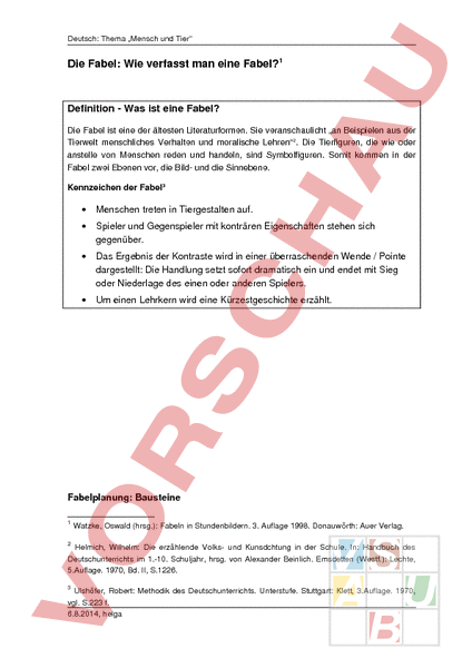 Deutsch: Thema „Mensch und Tier Die Fabel: Wie verfasst man eine Fabel? 1 Definition Was ist eine Fabel? Die Fabel ist eine der ältesten Literaturformen. Sie veranschaulicht „an Beispielen aus der Tierwelt menschliches Verhalten und moralische Lehren 2. Die Tierfiguren, die wie oder anstelle von Menschen reden und handeln, sind Symbolfiguren. Somit kommen in der Fabel zwei Ebenen vor, die Bild und die Sinnebene. Kennzeichen der Fabel3 • Menschen treten in Tiergestalten auf. • Spieler und Gegenspieler mit konträren Eigenschaften stehen sich gegenüber. • Das Ergebnis der Kontraste wird in einer überraschenden Wende Pointe dargestellt: Die Handlung setzt sofort dramatisch ein und endet mit Sieg oder Niederlage des einen oder anderen Spielers. • Um einen Lehrkern wird eine Kürzestgeschichte erzählt. Fabelplanung: Bausteine 1 Watzke, Oswald (hrsg.): Fabeln in Stundenbildern. 3. Auflage 1998. Donauwörth: Auer Verlag. 2 Helmich, Wilhelm: Die erzählende Volks und Kunsdchtung in der Schule. In: Handbuch des Deutschunterrichts im 1.10. Schuljahr, hrsg. von Alexander Beinlich. Emsdetten (Westf.): Lechte, 5.Auflage. 1970, Bd. II, S.1226. 3 Ulshöfer, Robert: Methodik des Deutschunterrichts. Unterstufe. Stuttgart: Klett, 3.Auflage. 1970, vgl. S.223 f. 6.8.2014, helga Deutsch: Thema „Mensch und Tier 1. Lehre oder Moral Überlege dir zu aller erst, was du mit der Geschichte aussagen möchtest. Auf dem Blatt der „Moral von Fabeln findest du sicherlich, was du suchst. (z.B: In schlechten Zeiten haben auch sehr Mächtige die Schwächeren nötig.) 2. Spieler Welche Charaktereigenschaft muss zwingen vorkommen, um diese Lehre zu verdeutlichen? Suche passende Adjektive und leite daraus ein passendes Tier ab. Oder denk dir ein Tier, das diese Person diesen Charakter am besten verkörpert. 3. Gegenspieler Nun brauchst du nur noch den passenden Gegenspieler. Du findest das Tier am einfachsten, wenn du ein gegensätzliches Adjektiv zum Hauptdarsteller suchst. (z.B: mächtig, stark schwach Löwe Maus) 4. Ausgangssituation Wo ist der Spieler, wo der Gegenspieler? Welche typischen Eigenschaften haben beide Charaktere? Welches ist die Absicht des Spielers? 5. Konflikt Höhepunkt Konflikt: Aktion Was macht der Spieler, um sein Ziel zu erreichen? Konflikt: Reaktion Wie reagiert der Gegenspieler? Bildet die Reaktion einen Höhepunkt? Höhepunkt Worin gipfelt der Konflikt? (z.B: Die Maus befreit den Löwen, indem sie das Seil, an welchem er gefangen ist, durchnagt.) 6. Auflösung Ist das Ende der Fabel erkennbar? Ist die Moral Lehre erkennbar? Welches Tier ist in welcher Position (Gewinner – Verlierer)? (z.B: Die anfänglich hilflose Maus ist dem Löwen plötzlich überlegen. Moral: In schlechten Zeiten haben auch sehr Mächtige die Schwächeren nötig.) 6.8.2014, helga