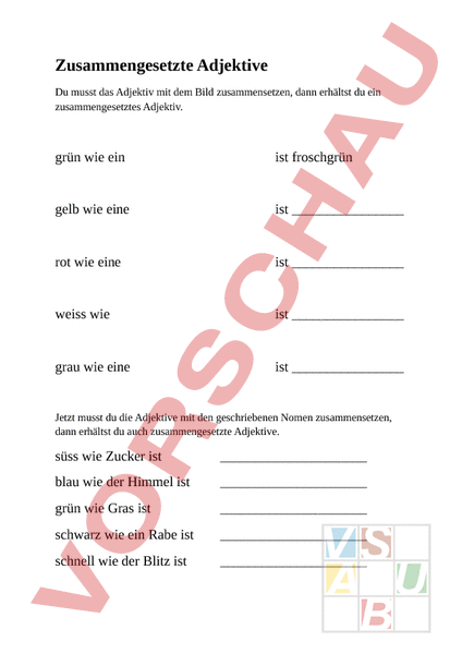 Zusammengesetzte Adjektive Du musst das Adjektiv mit dem Bild zusammensetzen, dann erhältst du ein zusammengesetztes Adjektiv. grün wie ein ist froschgrün gelb wie eine ist rot wie eine ist weiss wie ist grau wie eine ist Jetzt musst du die Adjektive mit den geschriebenen Nomen zusammensetzen, dann erhältst du auch zusammengesetzte Adjektive. süss wie Zucker ist blau wie der Himmel ist grün wie Gras ist schwarz wie ein Rabe ist schnell wie der Blitz ist