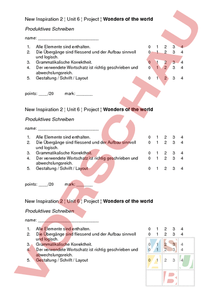 New Inspiration 2 Unit 6 Project Wonders of the world Produktives Schreiben name: 1. 2. 3. 4. 5. Alle Elemente sind enthalten. Die Übergänge sind fliessend und der Aufbau sinnvoll und logisch. Grammatikalische Korrektheit. Der verwendete Wortschatz ist richtig geschrieben und abwechslungsreich. Gestaltung Schrift Layout points: /20 0 0 1 1 2 2 3 3 4 4 0 0 1 1 2 2 3 3 4 4 0 1 2 3 4 0 0 1 1 2 2 3 3 4 4 0 0 1 1 2 2 3 3 4 4 0 1 2 3 4 0 0 1 1 2 2 3 3 4 4 0 0 1 1 2 2 3 3 4 4 0 1 2 3 4 mark: New Inspiration 2 Unit 6 Project Wonders of the world Produktives Schreiben name: 1. 2. 3. 4. 5. Alle Elemente sind enthalten. Die Übergänge sind fliessend und der Aufbau sinnvoll und logisch. Grammatikalische Korrektheit. Der verwendete Wortschatz ist richtig geschrieben und abwechslungsreich. Gestaltung Schrift Layout points: /20 mark: New Inspiration 2 Unit 6 Project Wonders of the world Produktives Schreiben name: 1. 2. 3. 4. 5. Alle Elemente sind enthalten. Die Übergänge sind fliessend und der Aufbau sinnvoll und logisch. Grammatikalische Korrektheit. Der verwendete Wortschatz ist richtig geschrieben und abwechslungsreich. Gestaltung Schrift Layout points: /20 mark: Bemerkungen zur Durchführung Nach dem Besprechen von wonders of the world wählt jeder eines aus. Als vorbereitende Hausaufgabe macht er folgendes: • 23 Bilder davon suchen und ausdrucken • Infos suchen, damit die Fragen im Buch S.82 in ex.2 beantwortet warden können. In der nächsten Lektion erstellen die Schüler ein kleines Poster mit Text zu ihrem wonder of the world.