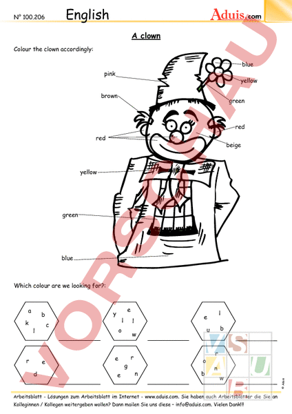 English N 100.206 com clown Colour the clown accordingly: blue pink yellow brown green red red beige yellow green blue Which colour are we looking for?: d e n n Arbeitsblatt Lösungen zum Arbeitsblatt im Internet www.aduis.com. Sie haben auch Arbeitsblätter die Sie an Kolleginnen Kollegen weitergeben wollen? Dann mailen Sie uns diese – Vielen Dank!!! Aduis