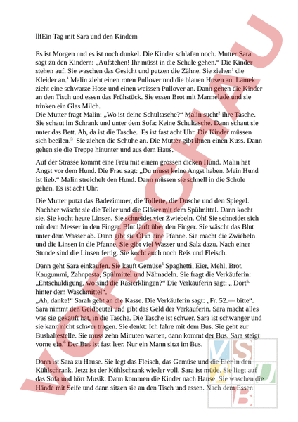 llfEin Tag mit Sara und den Kindern Es ist Morgen und es ist noch dunkel. Die Kinder schlafen noch. Mutter Sara sagt zu den Kindern: „Aufstehen! Ihr müsst in die Schule gehen. Die Kinder stehen auf. Sie waschen das Gesicht und putzen die Zähne. Sie ziehen1 die Kleider an.1 Malin zieht einen roten Pullover und die blauen Hosen an. Lamek zieht eine schwarze Hose und einen weissen Pullover an. Dann gehen die Kinder an den Tisch und essen das Frühstück. Sie essen Brot mit Marmelade und sie trinken ein Glas Milch. Die Mutter fragt Malin: „Wo ist deine Schultasche? Malin sucht2 ihre Tasche. Sie schaut im Schrank und unter dem Sofa: Keine Schultasche. Dann schaut sie unter das Bett. Ah, da ist die Tasche. Es ist fast acht Uhr. Die Kinder müssen sich beeilen.3 Sie ziehen die Schuhe an. Die Mutter gibt ihnen einen Kuss. Dann gehen sie die Treppe hinunter und aus dem Haus. Auf der Strasse kommt eine Frau mit einem grossen dicken Hund. Malin hat Angst vor dem Hund. Die Frau sagt: „Du musst keine Angst haben. Mein Hund ist lieb. Malin streichelt den Hund. Dann müssen sie schnell in die Schule gehen. Es ist acht Uhr. Die Mutter putzt das Badezimmer, die Toilette, die Dusche und den Spiegel. Nachher wäscht sie die Teller und die Gläser mit dem Spülmittel. Dann kocht sie. Sie kocht heute Linsen. Sie schneidet vier Zwiebeln. Oh! Sie schneidet sich mit dem Messer in den Finger. Blut läuft über den Finger. Sie wäscht das Blut unter dem Wasser ab. Dann gibt sie Öl in eine Pfanne. Sie macht die Zwiebeln und die Linsen in die Pfanne. Sie gibt viel Wasser und Salz dazu. Nach einer Stunde sind die Linsen fertig. Sie kocht auch noch Reis und Fleisch. Dann geht Sara einkaufen. Sie kauft Gemüse4, Spaghetti, Eier, Mehl, Brot, Kaugummi, Zahnpasta, Spülmittel und Nähnadeln. Sie fragt die Verkäuferin: „Entschuldigung, wo sind die Rasierklingen? Die Verkäuferin sagt: „ Dort5, hinter dem Waschmittel. „Ah, danke! Sarah geht an die Kasse. Die Verkäuferin sagt: „Fr. 52.— bitte. Sara nimmt den Geldbeutel und gibt das Geld der Verkäuferin. Sara macht alles was sie gekauft hat, in die Tasche. Die Tasche ist schwer. Sara ist schwanger und sie kann nicht schwer tragen. Sie denkt: Ich fahre mit dem Bus. Sie geht zur Bushaltestelle. Sie muss zehn Minuten warten, dann kommt der Bus. Sara steigt vorne ein.6 Der Bus ist fast leer. Nur ein Mann sitzt im Bus. Dann ist Sara zu Hause. Sie legt das Fleisch, das Gemüse und die Eier in den Kühlschrank. Jetzt ist der Kühlschrank wieder voll. Sara ist müde. Sie liegt auf das Sofa und hört Musik. Dann kommen die Kinder nach Hause. Sie waschen die Hände mit Seife und dann sitzen sie an den Tisch und essen. Nach dem Essen erzählen die Kinder von der Schule. Sie reden viel. Sara hört zu8. Die Kinder haben ein neues Buch von der Schule mit vielen Bildern9. Malin sagt: „Schau, Mama! Das ist eine Ziege und das ist ein Schaf und das eine Kuh. Und hier10 ist ein Löwe und eine Giraffe. Die Mutter schaut. Dann machen die Kinder die Hausaufgaben. Sie lernen neue Deutsch Wörter und sie schreiben viele Sätze in das Heft. Lamek sagt: „Wo ist mein Heft? Er sucht es in der Tasche und in seinem Zimmer. Er findet11 es nicht. Er denkt: „Oh je, ich habe mein Heft in der Schule vergessen. Die Mutter sagt: „Du vergisst12 alles. Dann lesen die Kinder in einem Buch. Dann sind die Hausaufgaben fertig. Lamek spielt im Kinderzimmer mit einem kleinen Auto. Malin spielt auch. Die Kinder sind laut und schreien. Die Mutter sagt: Lamek, Malin, leise, nicht so schreien. Ich muss ein bisschen schlafen. Jetzt sind die Kinder leise. Am Nachmittag geht die Mutter mit Malin zum Augenarzt. Malin hat Schmerzen in den Augen. Der Arzt fragt viel. Dann sagt er zu Malin: „Komm, sitz auf diesen Stuhl. Der Doktor nimmt eine kleine Lampe und schaut Malin in die Augen. Er sagt: „Schau mit beiden Augen auf mein linkes Ohr. „Und jetzt, schau mit beiden Augen auf mein rechtes Ohr. Malin macht was der Doktor sagt. Dann gibt der Arzt der Mutter Tropfen für Malins Augen. Malin hat eine Allergie. Malin muss jeden Morgen und jeden Abend einen Tropfen in die Augen machen. Dann geht die Mutter in das Spital. Eine Frau aus Eritrea hat ein Baby bekommen. Sie geht zur Information und fragt: „In welchem Zimmer ist Frau Azieb Tesfay? Die Frau sagt: „Zimmer 204. Sara geht zu Azieb ins Zimmer. Azieb ist noch sehr müde. Aber sie ist glücklich. Das Baby ist gestern geboren. Es ist ein Mädchen. Es ist gesund. Es heisst Helen. Helen hat schon viele lange Haare. Helen ist hübsch13. Sie ist ähnlich wie Azieb. Azieb hat auch schöne Augen und einen schönen Mund. Im Zimmer hat es viele Leute. Alle reden. Es ist laut. Das Baby schreit. Es hat Hunger. Die Krankenschwester kommt und bringt14 Tee. Sara sagt: „Ich muss nach Hause gehen. Die Kinder warten zu Hause. Sara sagt auf Wiedersehen und geht nach Hause. Es regnet und Sara wird nass. Sie hat keinen Schirm. Zu Hause zieht sie trockene15 Kleider an. Fragen. Bitte in einem ganzen Satz antworten. 1. Was machen die Kinder nach dem Aufstehen? . 2. Was essen die Kinder zum Frühstück? . 3. Wo ist die Schultasche von Malin? 4. Vor wem hat Malin Angst auf der Strasse? vor dem Auto vor dem Hund vor einem Jungen 5. Der Hund ist böse lieb 6. Was putzt die Mutter? 7. Was macht die Mutter nach dem Putzen? 8. Die Mutter schneidet sich in den Finger in das Bein 9. Was wäscht die Mutter unter dem Wasser ab? . 10. Die Mutter kocht mit Salz. richtig falsch 11. Wie lange kochen die Linsen? . 12. Was macht Sara nach dem kochen? 13. Wie viele Dinge kauft Sara? 14. Wo sind die Rasierklingen? 15. Wieviel muss Sara für den Einkauf bezahlen? 16. Warum kann Sara nicht schwer tragen? 17. Wie lange muss Sara warten, bis der Bus kommt? 18. Im Bus hat es viele Leute. richtig falsch 19. Wo legt Sara das Fleisch, das Gemüse und die Eier hin? 20. Was machen die Kinder vor dem Essen? . 21. Wovon erzählen die Kinder nach dem Essen? von andern Kindern von einem Film im 