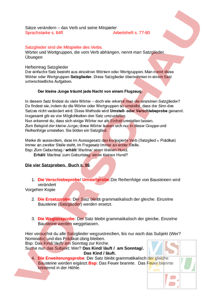 Sätze verändern – das Verb und seine Mitspieler Sprachstarke s. 84ff Arbeitsheft s. 77-80 Satzglieder sind die Mitspieler des Verbs. Wörter und Wortgruppen, die vom Verb abhängen, nennt man Satzglieder. Übungen Hefteintrag Satzglieder Der einfache Satz besteht aus einzelnen Wörtern oder Wortgruppen. Man nennt diese Wörter oder Wortgruppen Satzglieder. Diese Satzglieder übernehmen in einem Satz unterschiedliche Aufgaben. Der kleine Junge träumt jede Nacht von einem Flugzeug. In diesem Satz findest du viele Wörter – doch wie erkennt man die einzelnen Satzglieder? Du findest sie, indem du die Wörter oder Wortgruppen so umstellst, dass der Sinn des Satzes nicht verändert wird. Diese Methode wird Umstell oder Verschiebeprobe genannt. Insgesamt gib es vier Möglichkeiten den Satz umzustellen. Nun erkennst du, dass sich einige Wörter nur als Einheit umstellen lassen. Zum Beispiel der kleine Junge; diese Wörter lassen sich nur in dieser Gruppe und Reihenfolge umstellen. Sie bilden ein Satzglied. Merke dir ausserdem, dass im Aussagesatz das konjugierte Verb (Satzglied Prädikat) immer an zweiter Stelle steht, im Fragesatz immer an erster Stelle. Bsp: Zum Geburtstag erhält/ Martina/ einen kleinen Hund. Erhält/ Martina/ zum Geburtstag/ einen kleinen Hund? Die vier Satzproben. Buch s. 96 1. Die Verschiebeprobe/ Umstellprobe:Die Reihenfolge von Bausteinen wird verändert Vorgehen Kopie 2. Die Ersatzprobe: Der Satz bleibt grammatikalisch der gleiche. Einzelne Bausteine (Satzglieder) werden ersetzt. 3. Die Weglassprobe: Der Satz bleibt grammatikalisch der gleiche. Einzelne Bausteine werden weggelassen. Hier versuchst du alle Satzglieder wegzustreichen, bis nur noch das Subjekt (Wer? Nominativ) und das Prädikat übrig bleiben. Bsp: Das Kind/ läuft/ am Sonntag zur Kirche. Suche nun das Subjekt: Wer? Das Kind/ läuft am Sonntag/. Das Kind läuft. 4. Die Erweiterungsprobe: Der Satz bleibt grammatikalisch der gleiche. Bausteine werden ergänzt.Bsp: Das Feuer brannte. Das Feuer brannte knisternd in der Höhle.