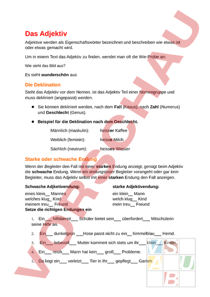Das Adjektiv Adjektive werden als Eigenschaftswörter bezeichnet und beschreiben wie etwas ist oder etwas gemacht wird. Um in einem Text das Adjektiv zu finden, wendet man oft die Wie-Probe an: Wie sieht das Bild aus? Es sieht wunderschön aus Die Deklination Steht das Adjektiv vor dem Nomen, ist das Adjektiv Teil einer Nomengruppe und muss dekliniert (angepasst) werden. Sie können dekliniert werden, nach dem Fall (Kasus), nach Zahl (Numerus) und Geschlecht (Genus). Beispiel für die Deklination nach dem Geschlecht. Männlich (maskulin): heisser Kaffee Weiblich (feminin): heisse Milch Sächlich (neutrum): heisses Wasser Starke oder schwache Endung Wenn der Begleiter den Fall mit einer starken Endung anzeigt, genügt beim Adjektiv die schwache Endung. Wenn ein endungsloser Begleiter vorangeht oder gar kein Begleiter, muss das Adjektiv selbst mit einer starken Endung den Fall anzeigen. Schwache Adjketivendung: starke Adjektivendung: eines klein Mannes welches klug_ Kind meinem treu Freund Setze die richtigen Endungen ein ein klein Mann welch klug Kind mein treu Freund Ein_ hilfsbereit_ Schüler bietet sein_ überfordert_ Mitschülerin seine Hilfe an. 1. 2. Ein_ dunkelgrünHose passt nicht zu ein himmelblau_ Hemd. 3. Ein_ liebevoll_ Mutter kümmert sich stets um ihr_ klein_ Kinder. 4. Ein_ reich_ Mann hat kein_ groß_ Probleme. 5. Da liegt ein_ verletzt_ Tier in Ihr_ gepflegt_ Garten. Nichdeklinierte Adjektive Nicht deklinierte Adjektive sind endungslos. Bei manchen Adjektiven gibt es nichtdeklinierte Formen mit und ohne auslautendes –e. Dieses –e ist keine Endung, sondern ist zum Stamm zu zählen. Zum Beispiel: Sei mir nicht bös/e. Der Geist ist unsichtbar. Der Graben ist tief. Die Vergleichsformen Adjektive können gesteigert werden, dieser Vorgang wird Komparation genannt. Positiv (Grundstufe): schön Komparativ (Höherstufe): schöner Superlativ (Höchststufe): am schönsten Positiv hart schnell genau gut hoch jung schlau schlank nah viel laut langweilig Komparativ Superlativ